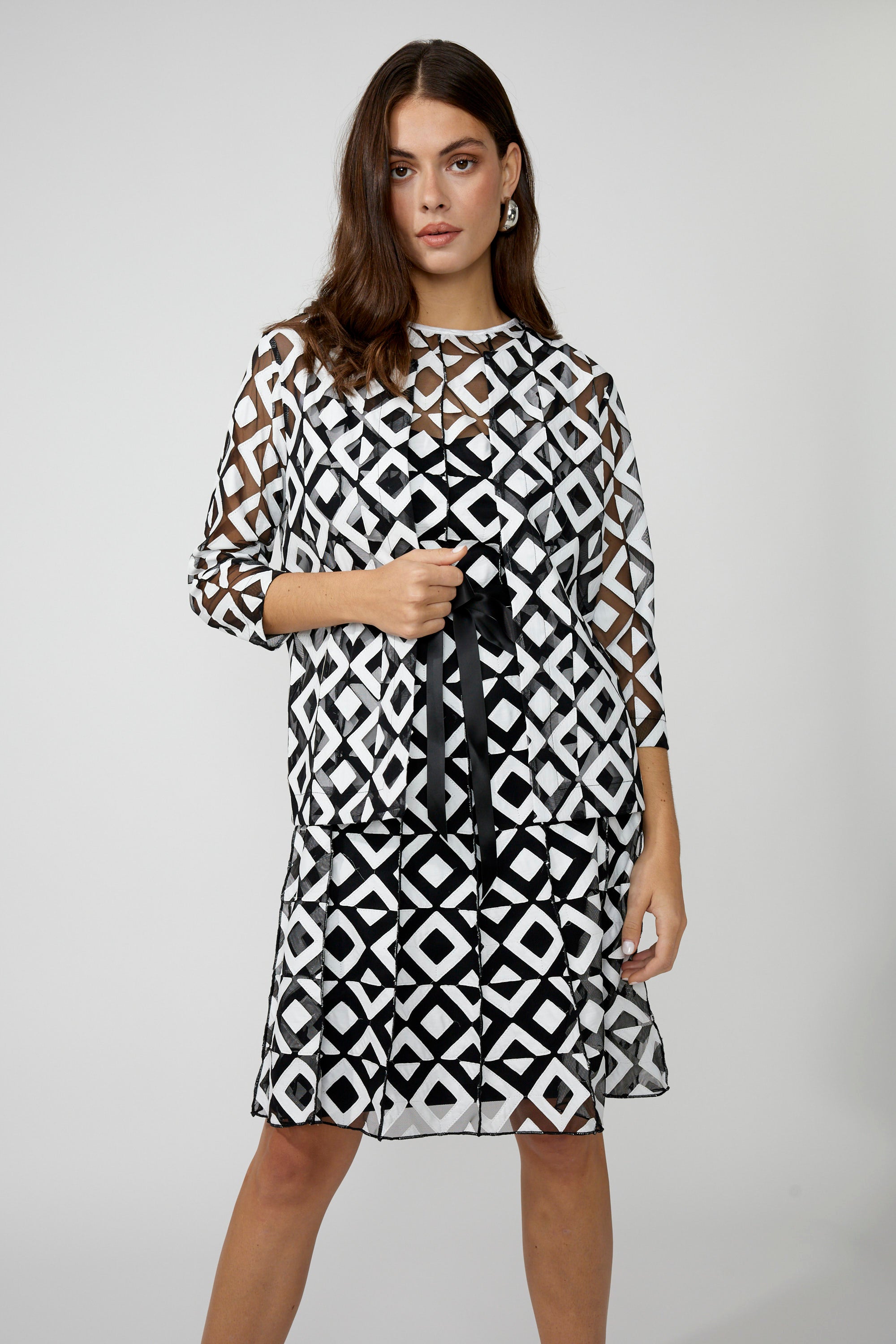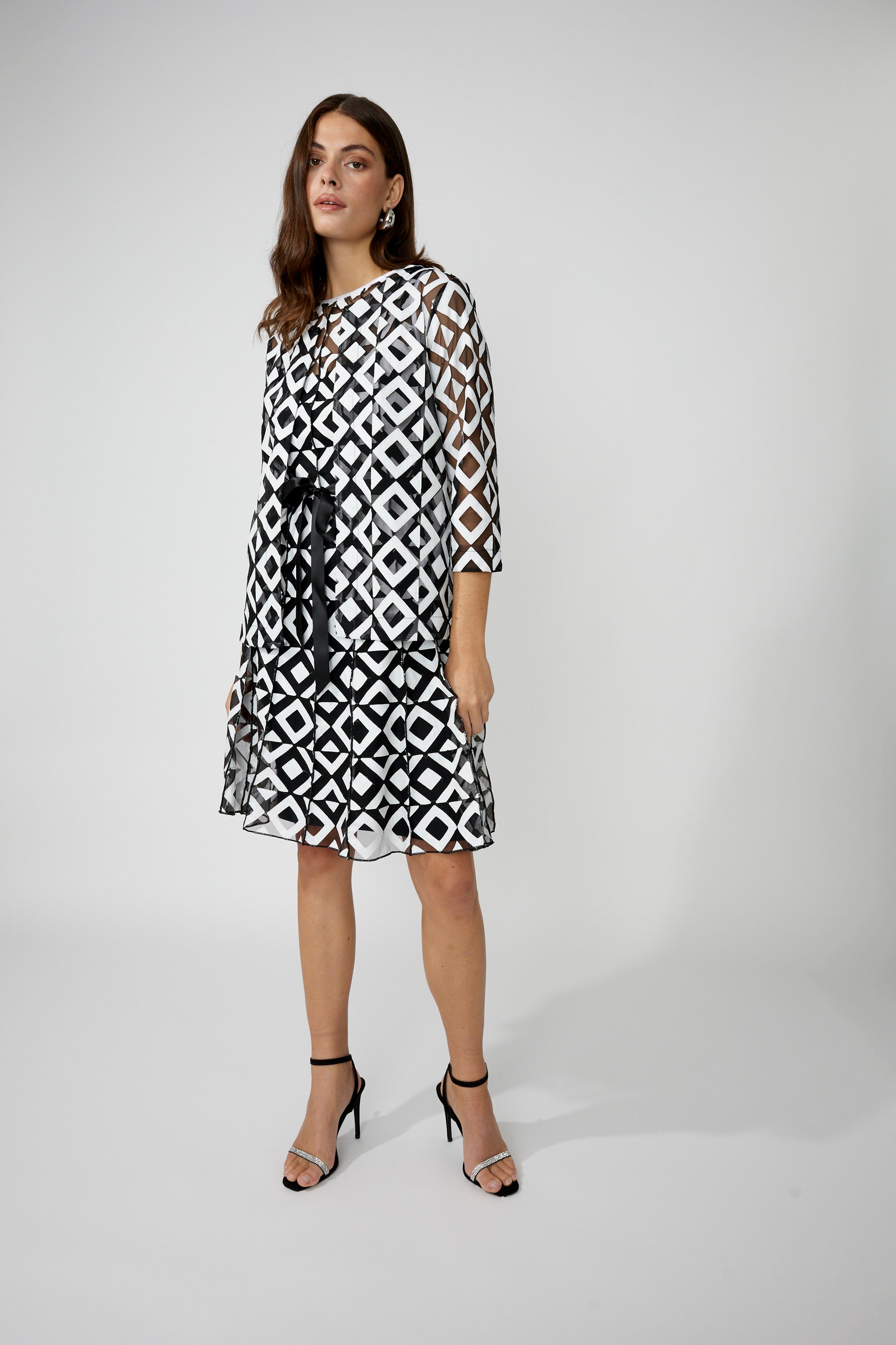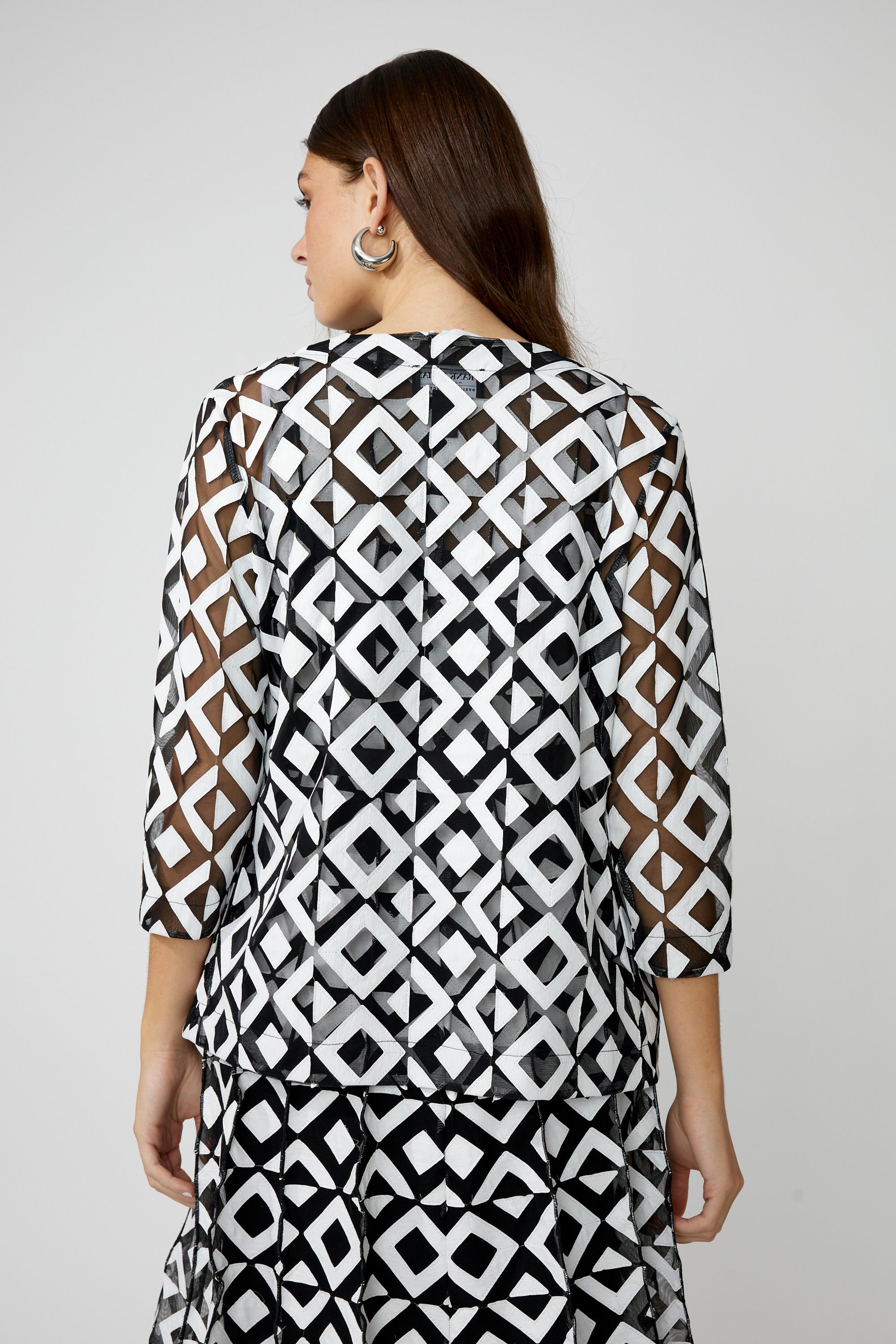 Discover the perfect blend of sophistication and style with this Frank Lyman piece. Featuring an open front closure, versatile regular fit, and 3/4 length sleeves, this hip-length overlay is designed for both formal and casual occasions. The geometric pattern and belted sheer design add a touch of edginess, while the round-neck creates a feminine, polished look.