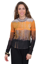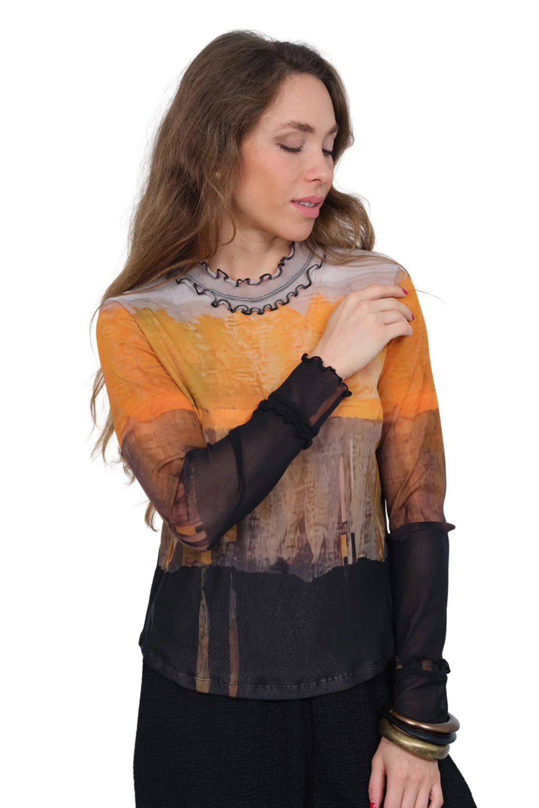 Abstract hues blend with sheer mesh fabric to create a top that’s both bold and delicate. The long sleeves flow into softly ruffled, lettuce-edge cuffs and neckline for an artful finish, while layered tones of amber, charcoal, and ochre make this piece stand out.