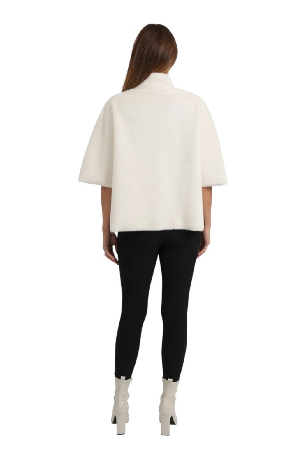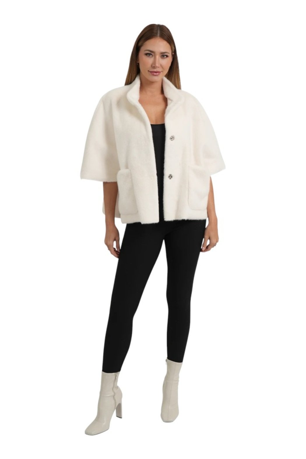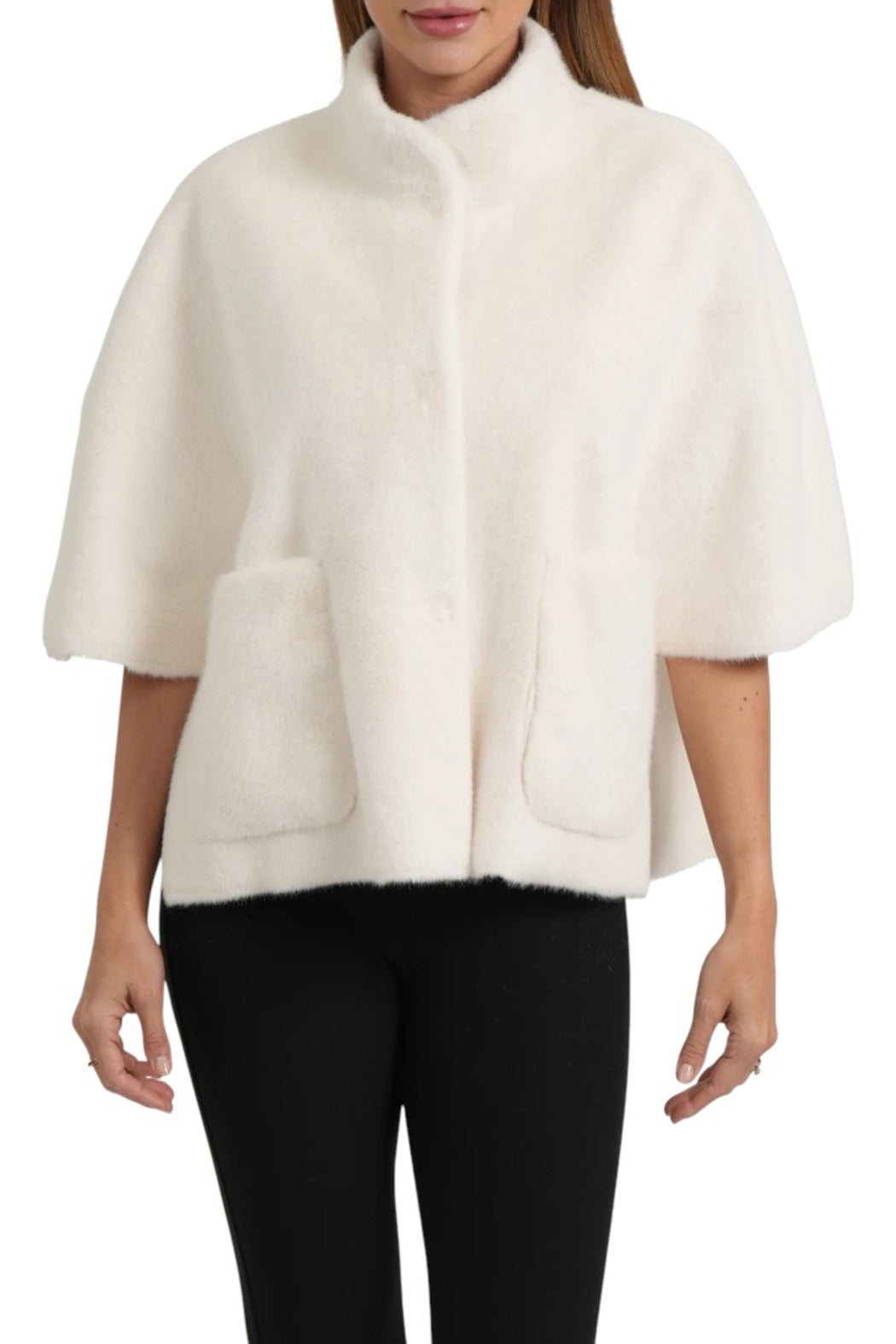 Violet faux fur cape coat, stand collar, front snap closure, front pockets, side slits, loose fit.