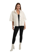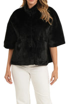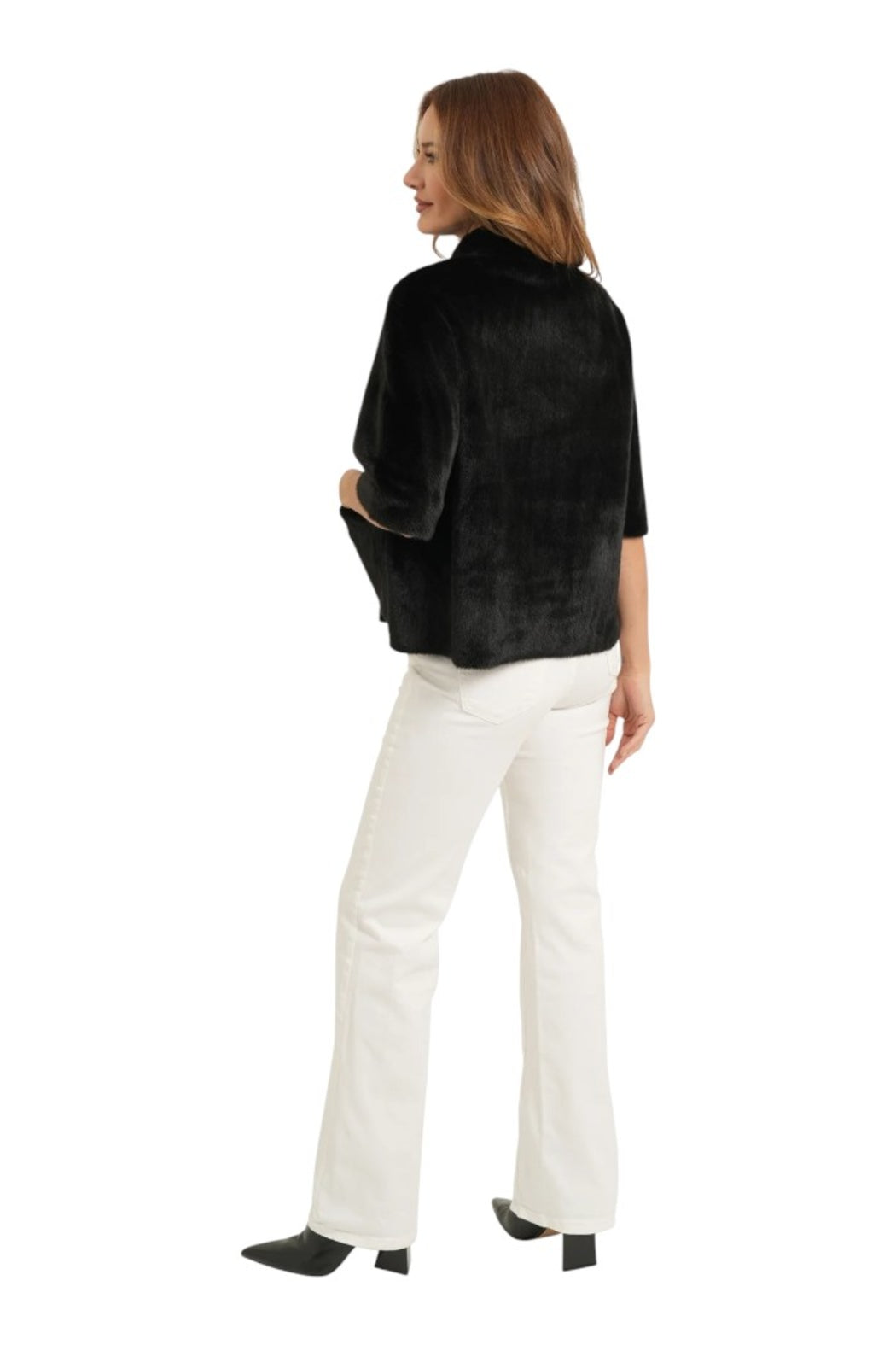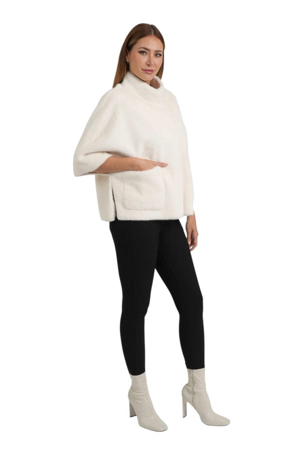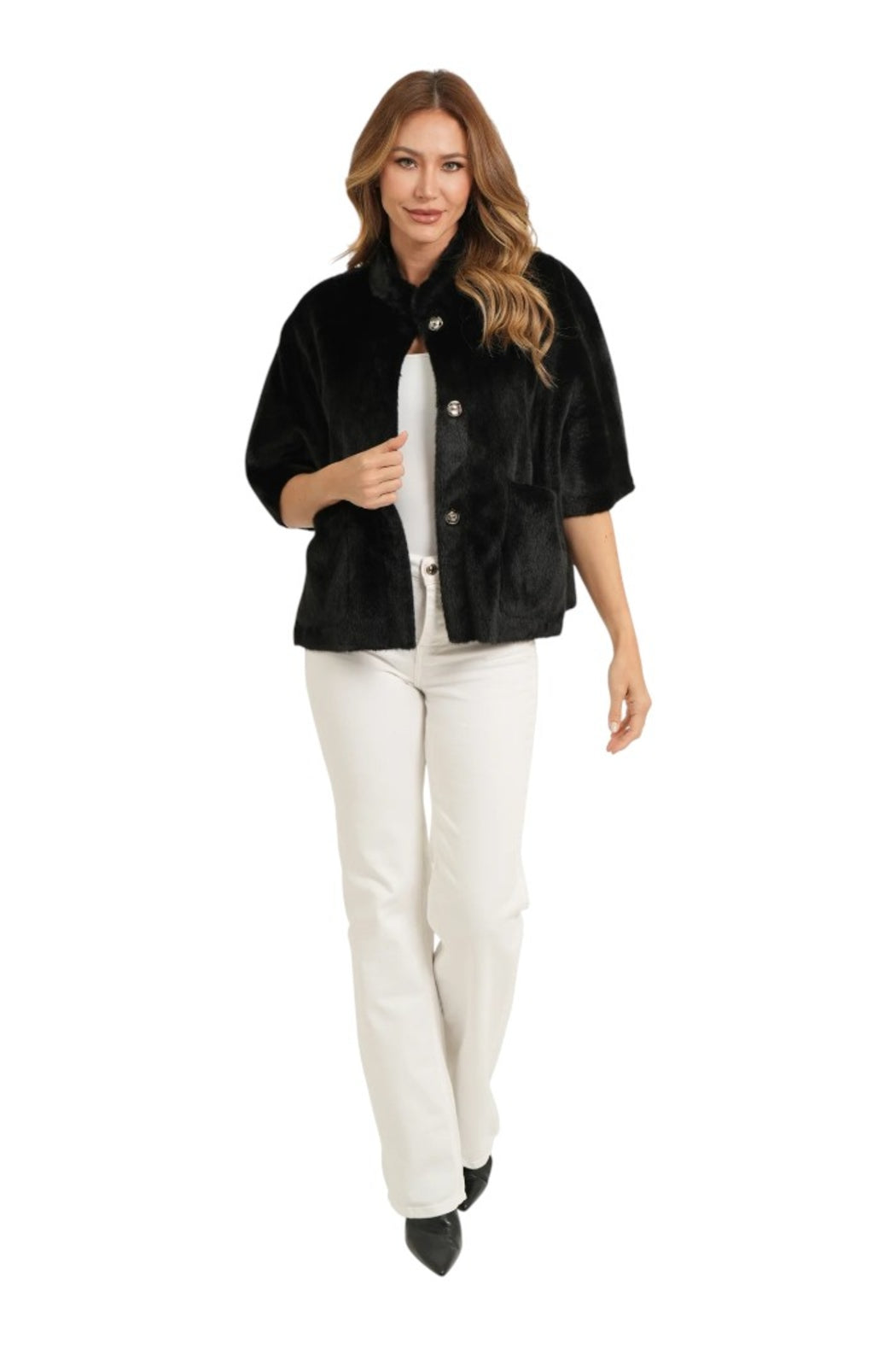 Violet faux fur cape coat, stand collar, front snap closure, front pockets, side slits, loose fit.