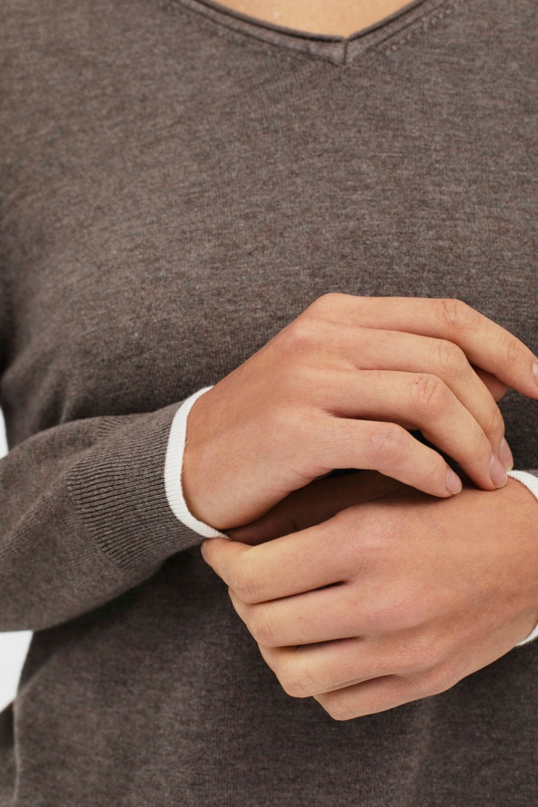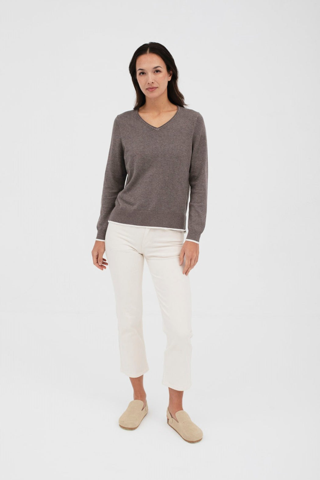 From Mus & Bombon this basic knitted jumper features long sleeves and a V-neck. The cuffs and hem are trimmed with an elegant contrasting color, giving it a modern and sophisticated style. Perfect for dressing up, down, or layering. This is the sweater you'll be reaching for season after season.