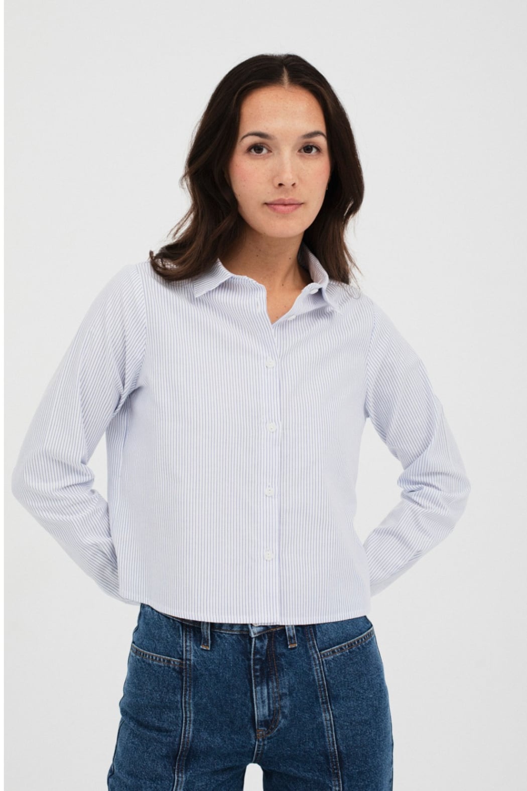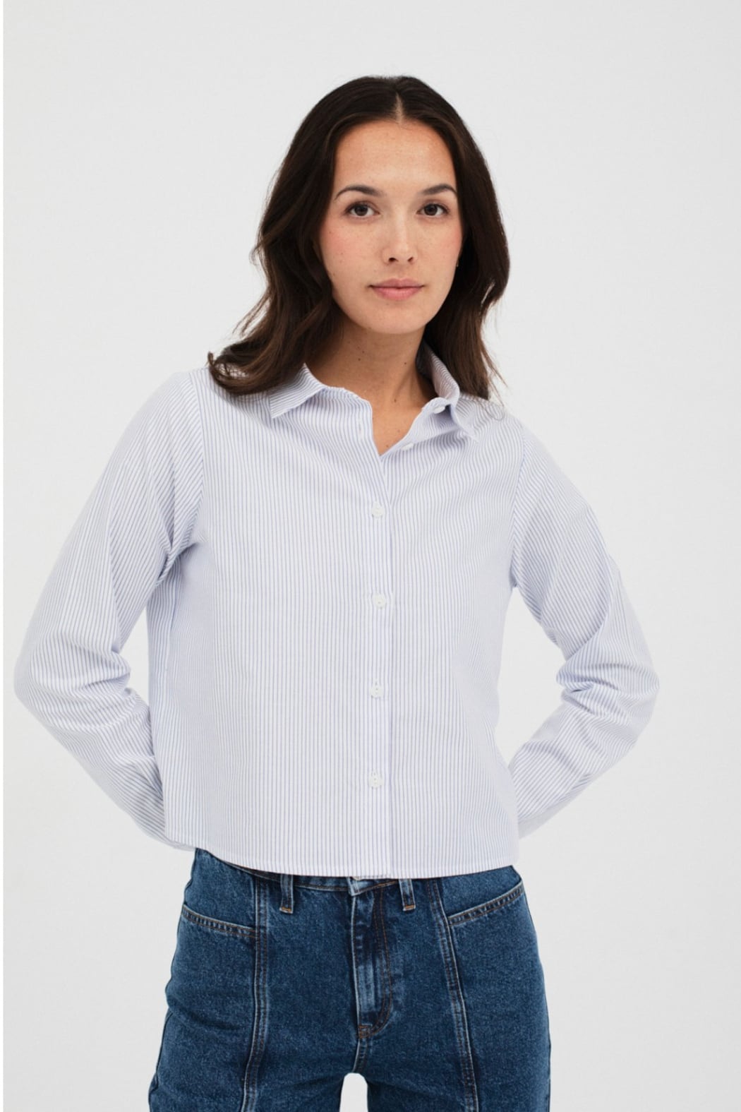 The Garbatella Shirt by Mus & Bombon is a cropped, long‑sleeve cotton shirt with a classic pointed collar, front button closure, and buttoned cuffs — a versatile, modern staple for any wardrobe. Made in Spain from 100 % cotton, it brings a crisp yet relaxed silhouette that pairs beautifully with high‑waisted trousers, skirts, or layered under a light jacket for polished, effortless style.