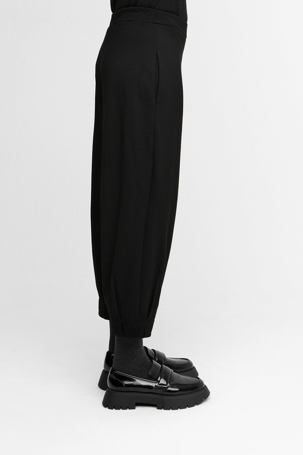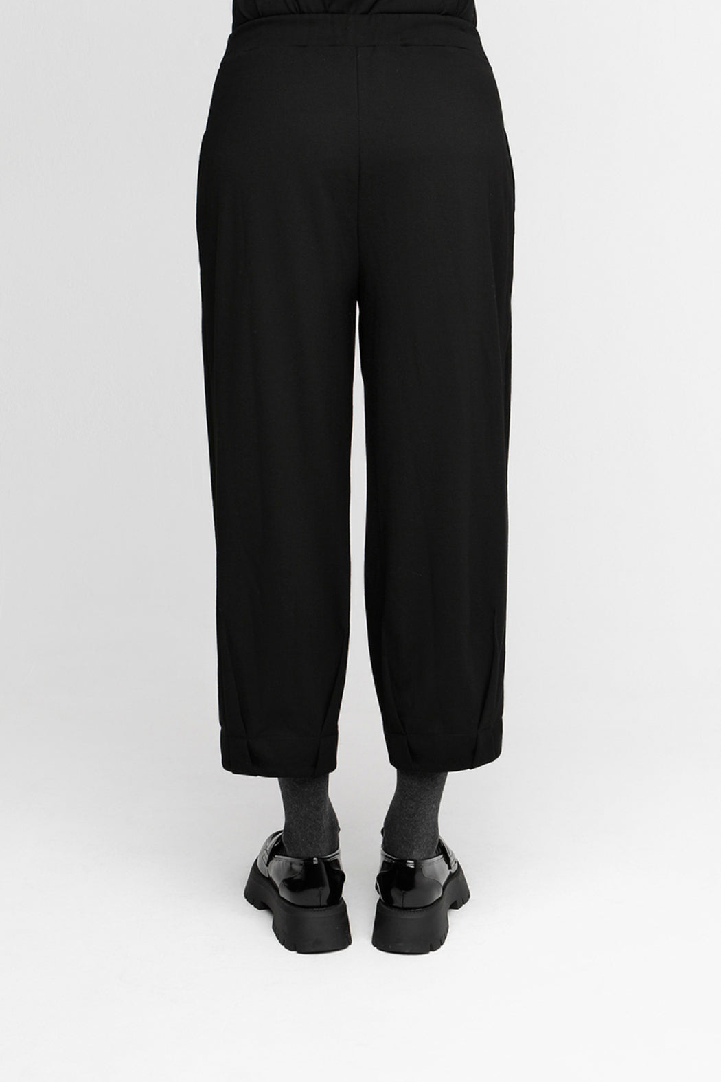 The tapered leg finishes with a pleated hem detail, adding subtle shape and texture, while side seam pockets bring practical versatility. Crafted from a soft, stretch jersey blend, they drape beautifully and retain comfort and structure through wear.