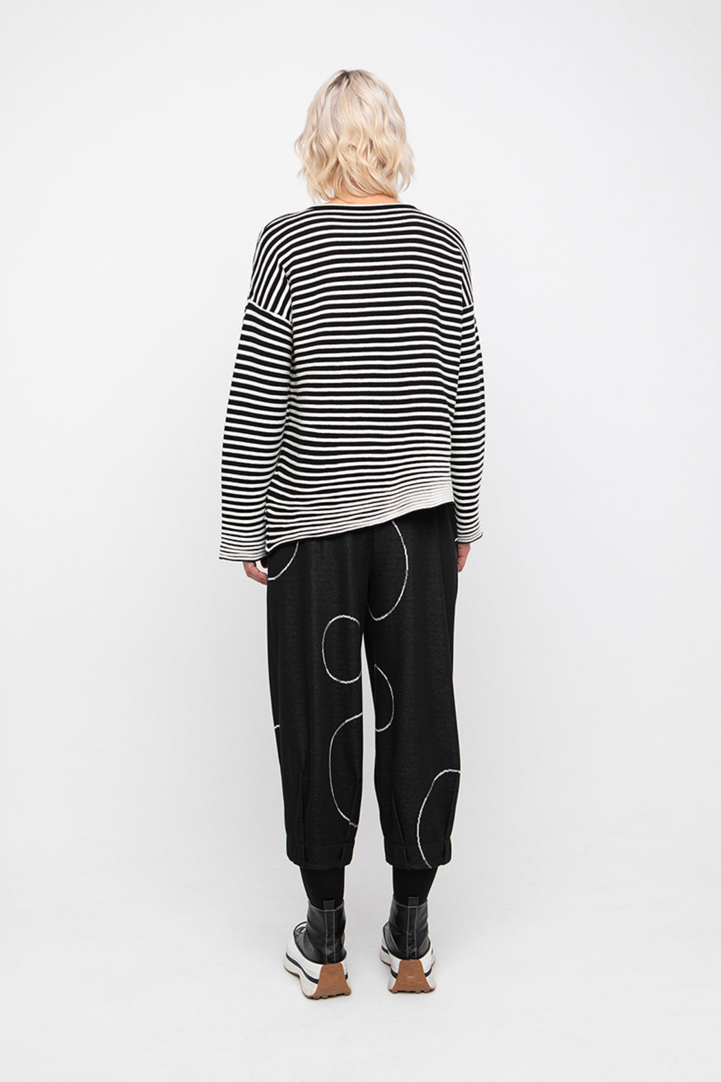 A modern take on relaxed elegance, the 766124 Knit Asymmetrical Stripe Top by Ozai N Ku features soft knit fabric and an asymmetrical cut that drapes beautifully across the body. The striped design adds visual rhythm, while the relaxed fit, angled hem, and subtle structural lines give it an effortless yet sculptural feel. Perfect for layering or worn alone.