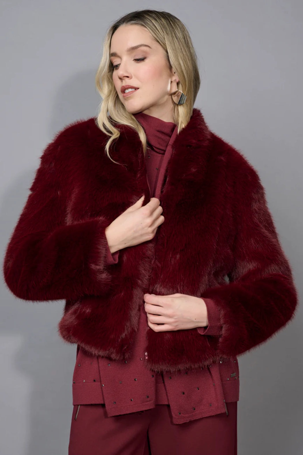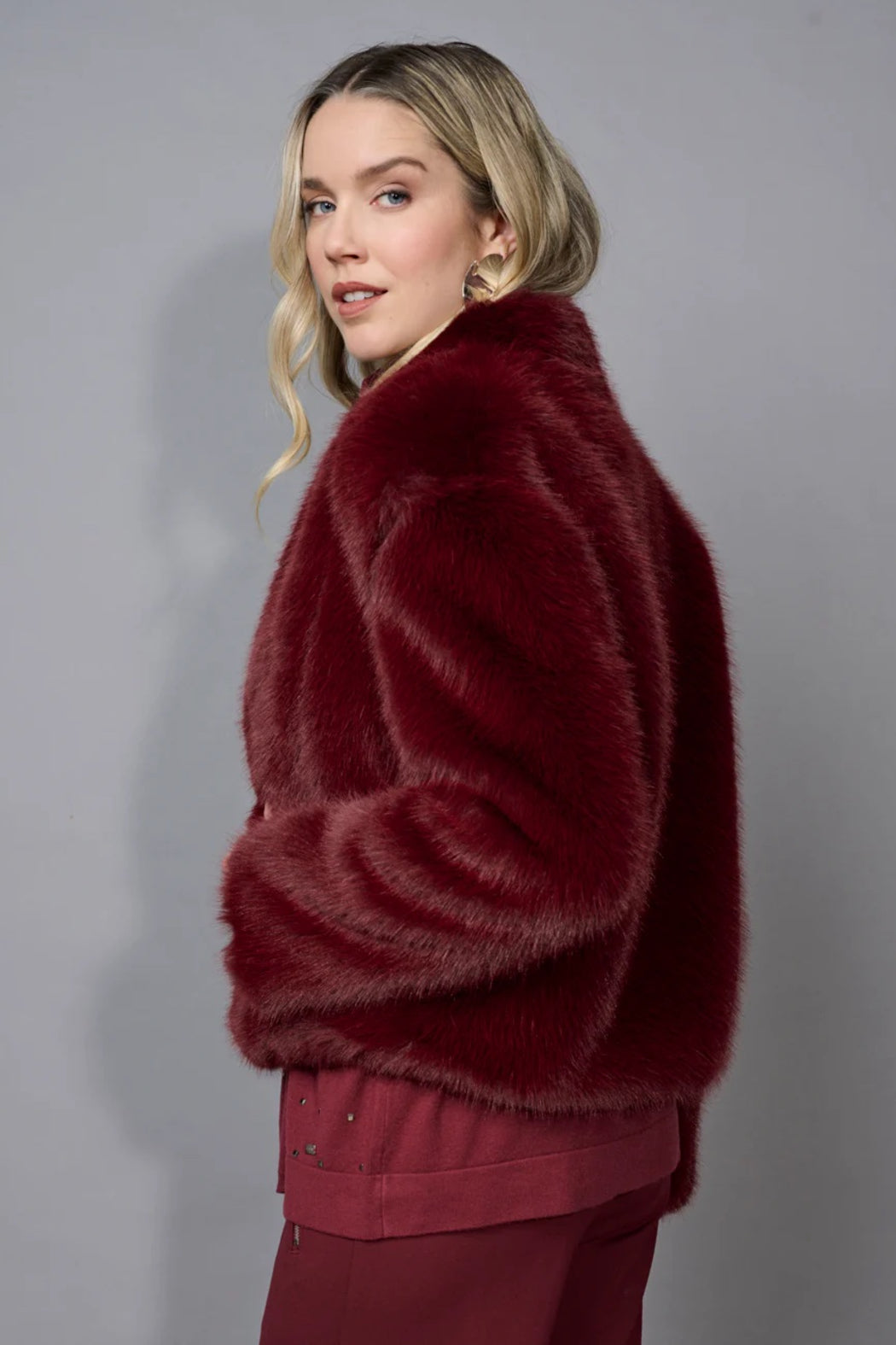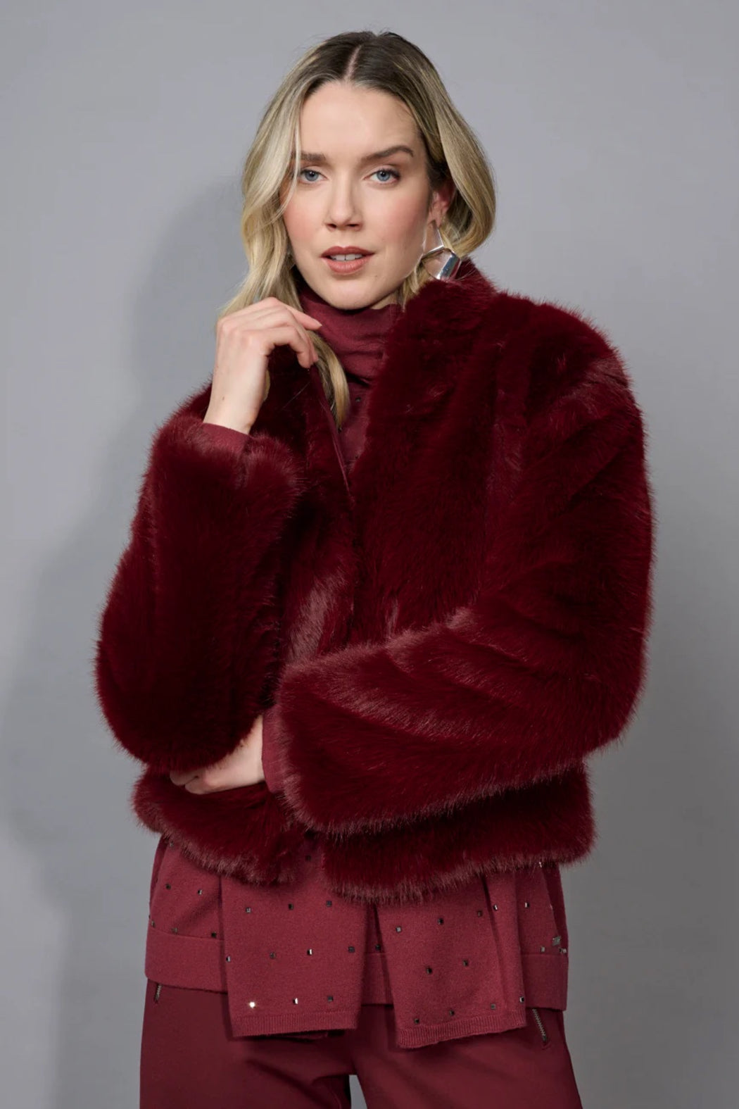 Plush and warm, the Zip-Front Faux Fur Jacket combines softness with structure. The zip-front design and cozy texture make it the ideal cold-weather statement layer in this season’s staple Bordeaux tone.