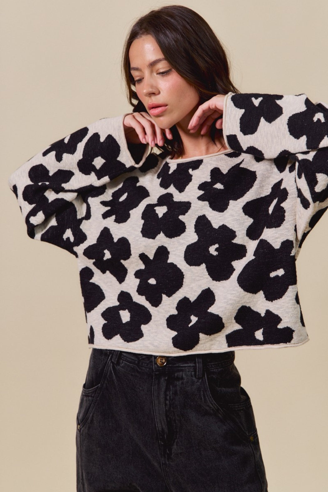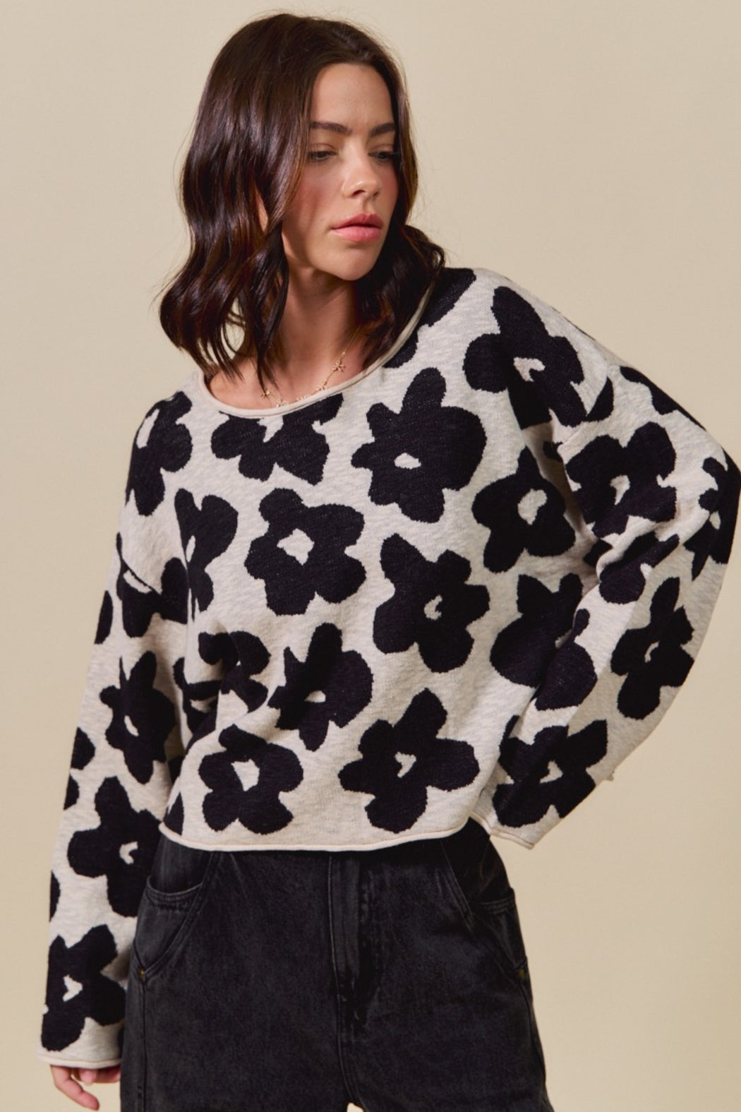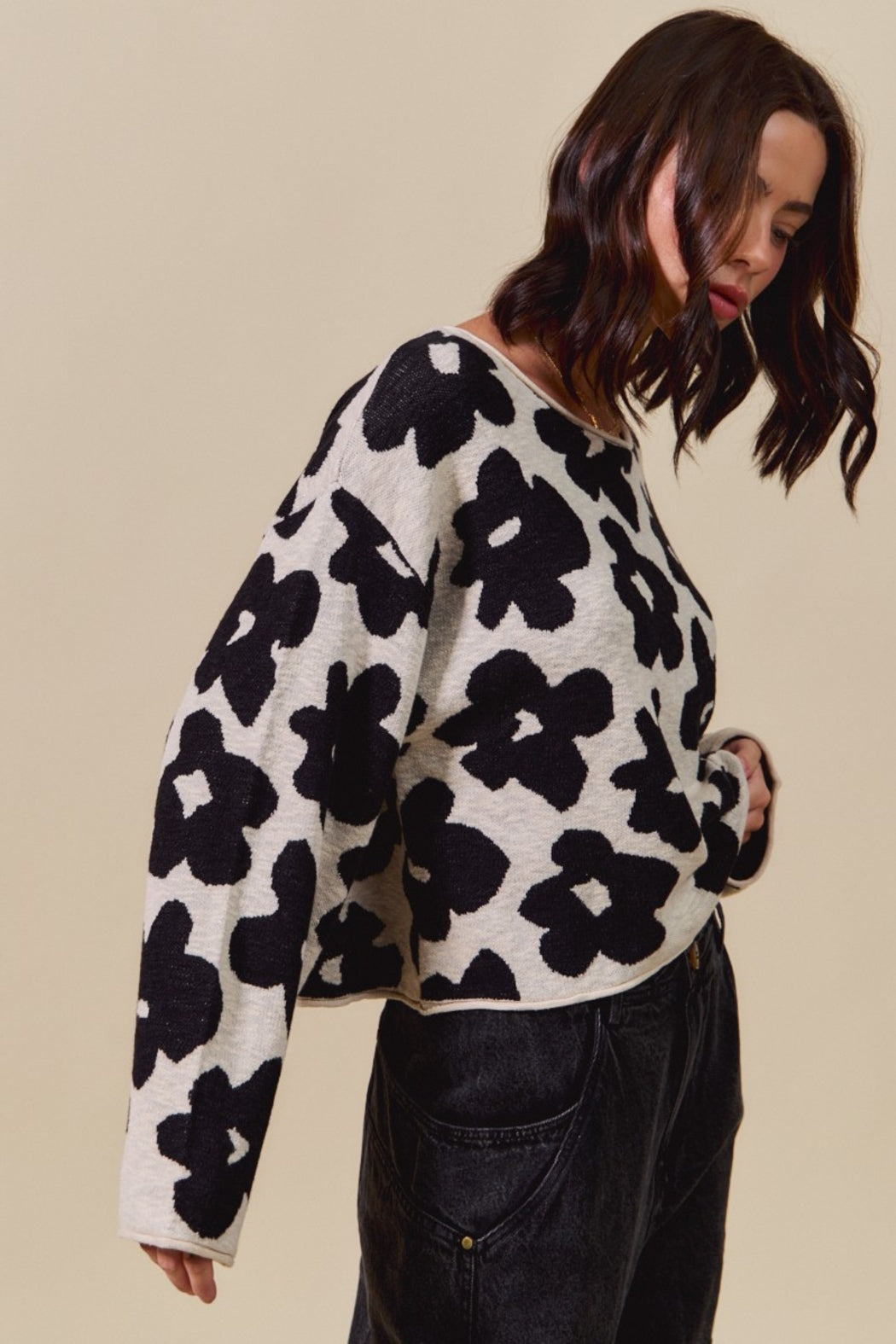 The Flower Sweater Top is a boxy style top with long bell sleeves. This loose fit top is lightweight and easy to pair with jeans, shorts or slacks.