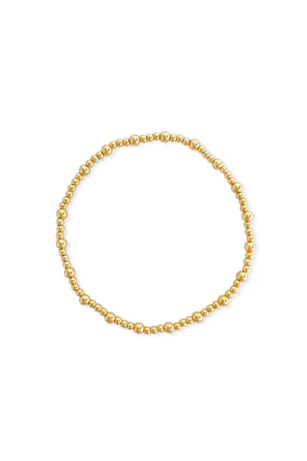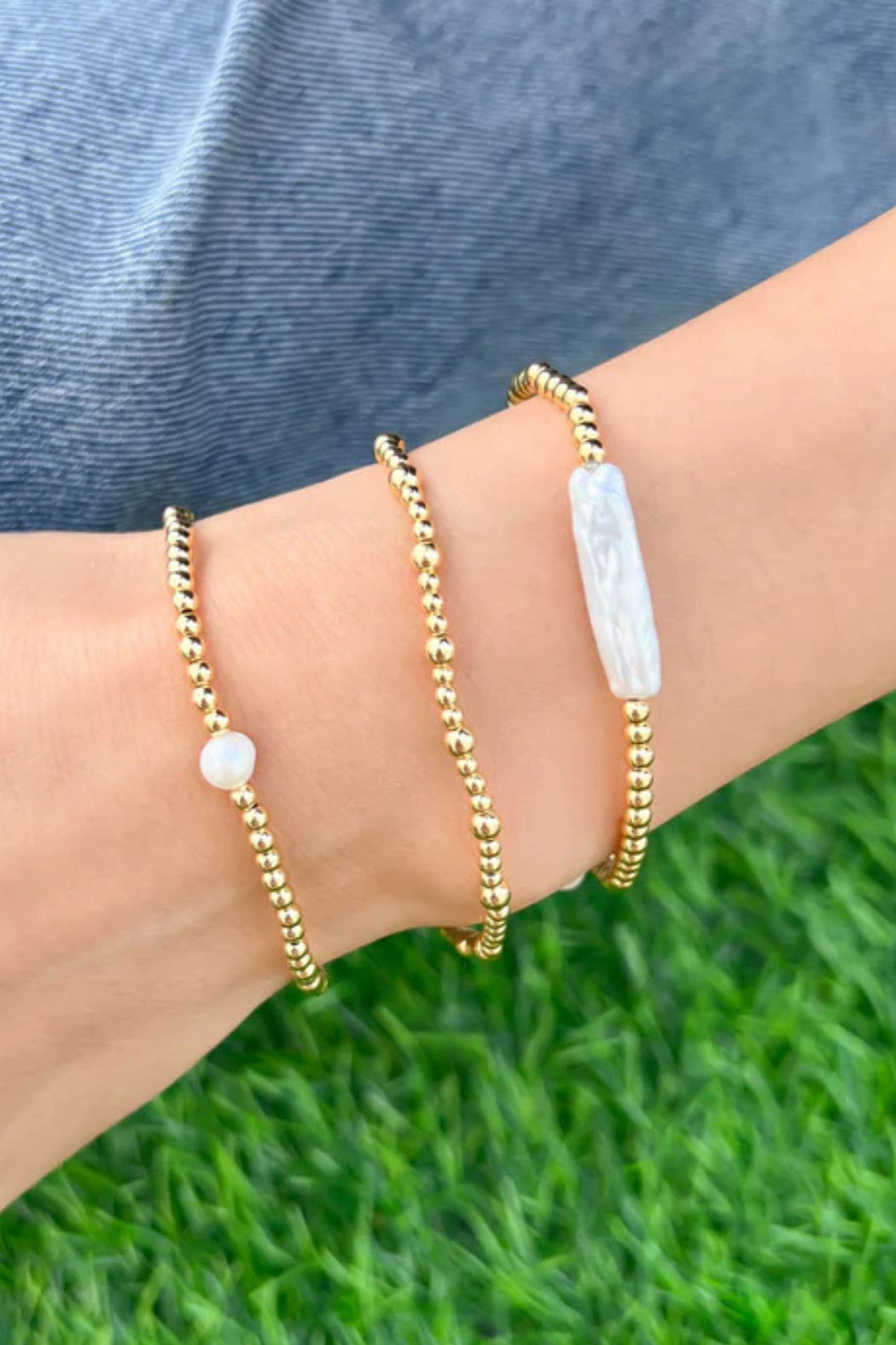 Beaded Stretch Bracelet This elegant bracelet features a harmonious blend of 3mm and 4mm beads, creating a subtle yet eye-catching design. Perfect for stacking or wearing alone, it adds a touch of sophistication to any outfit. Material: 14k gold plated, triple plated Size: Approx. 3-4mm beads