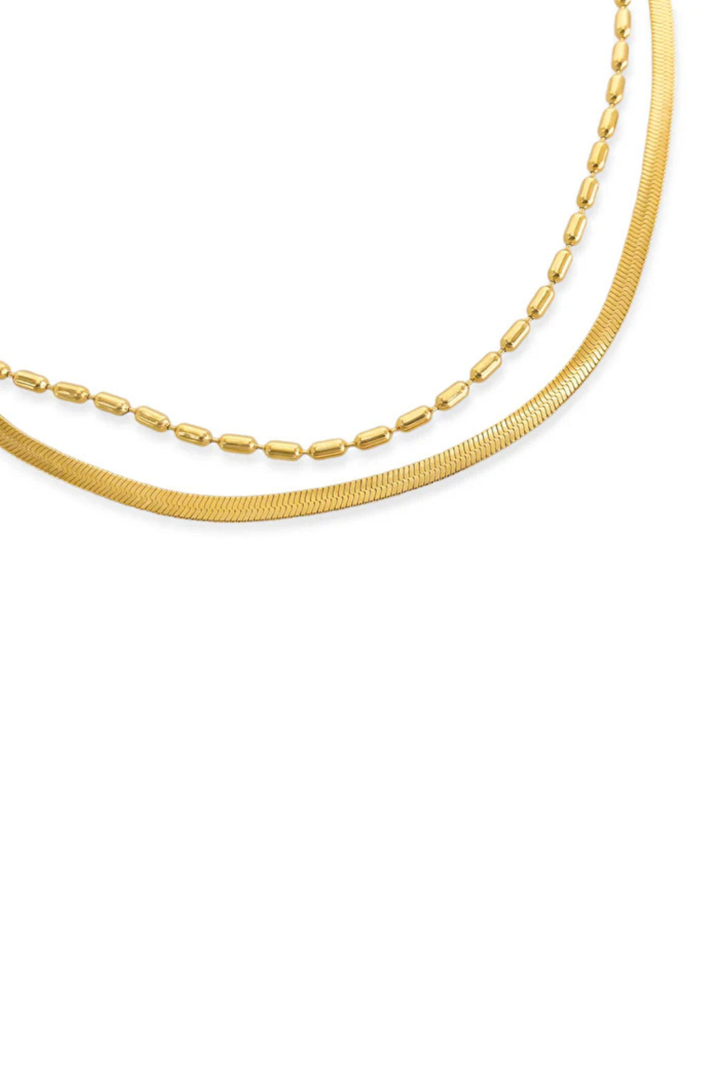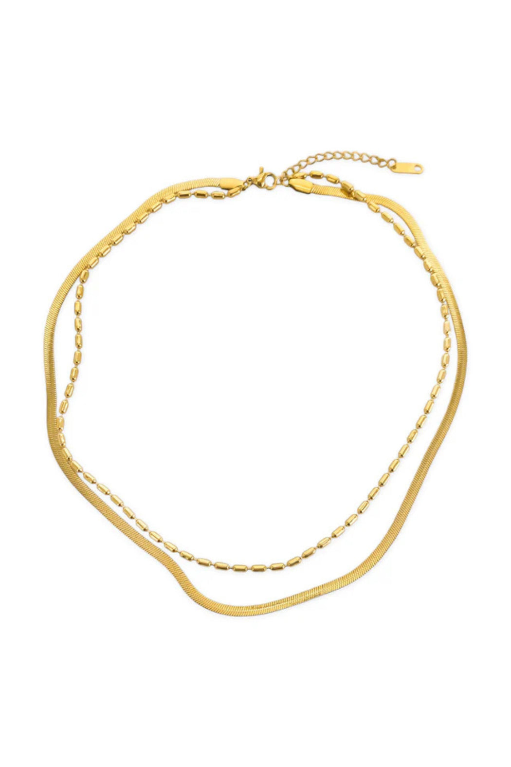 Water Resistant Necklace A double layered chain combining beaded and herringbone designs for a textured look. The mix of textures adds depth, making it a versatile piece that complements any style. Material: 18k gold triple plated, over stainless steel - water resistant/waterproof Size: Approx. 0.12" thick herringbone chain Length: Approx. 16"/17", plus a 2" extension Closure: Lobster clasp FINAL SALE