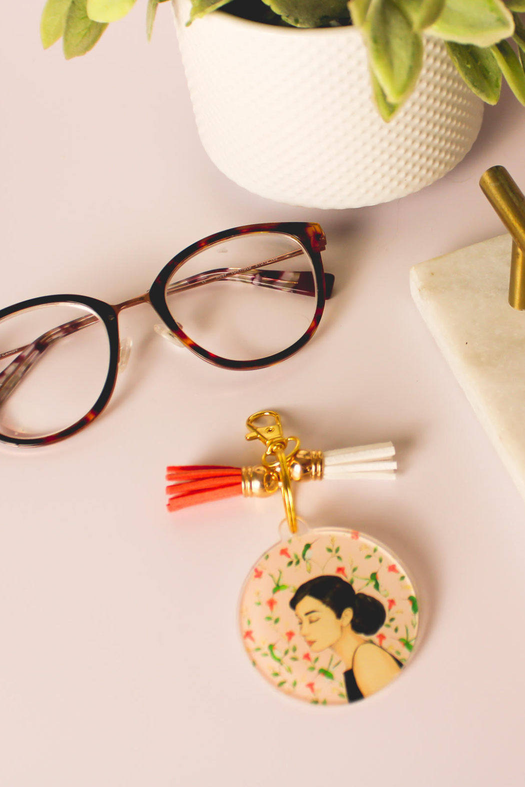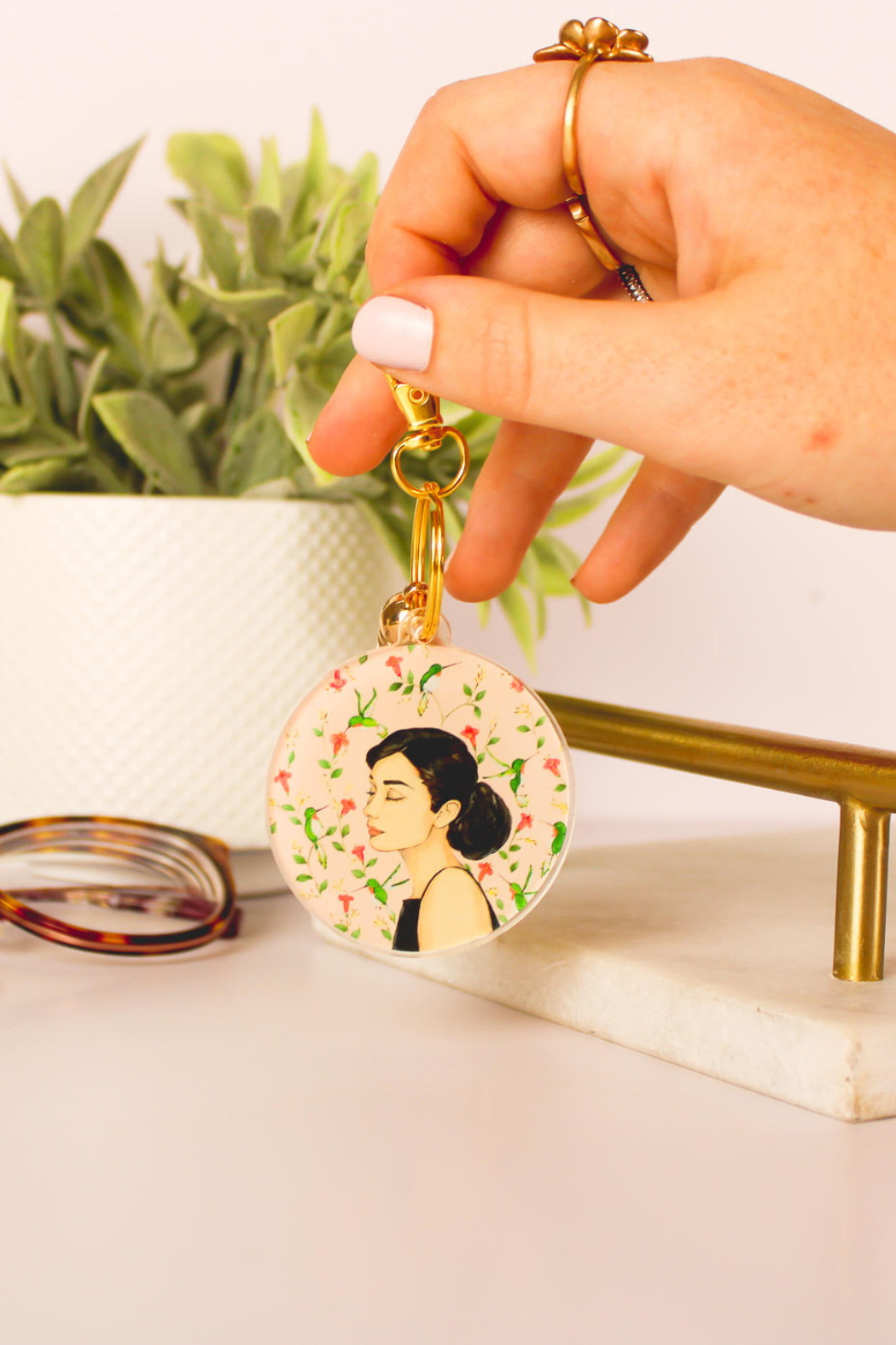 All acrylic keychain charms are 2 inches x 2 inches tall with gold metal accents.