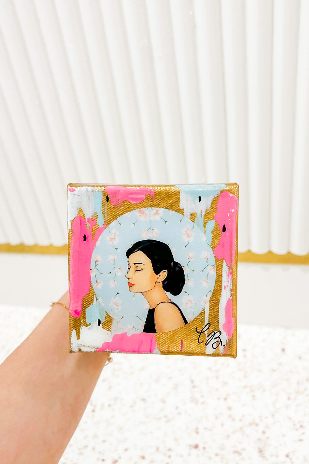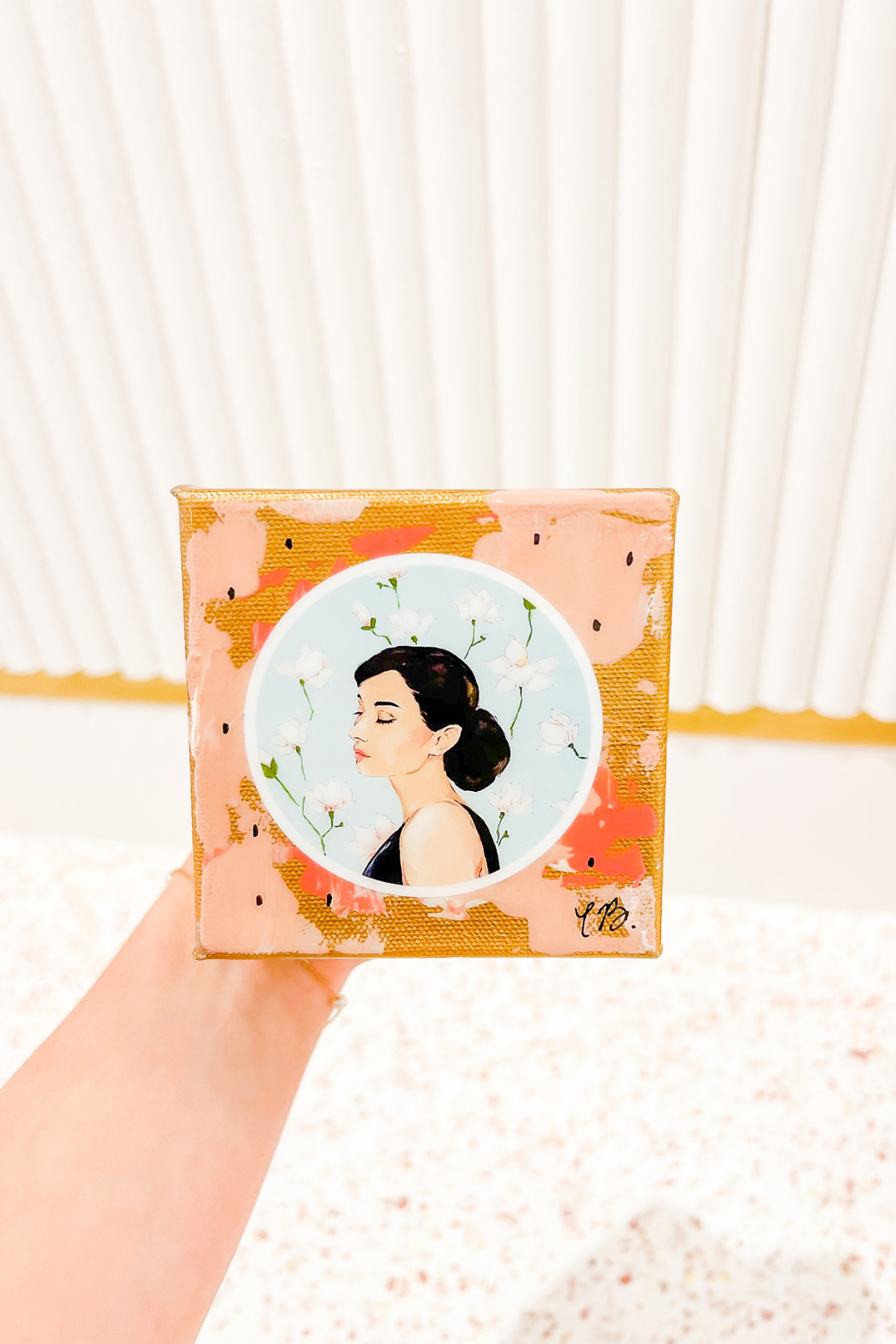 This 4 inches x 4 inches mini canvas shows Audrey on her iconic Tiffany Blue background with white magnolias.