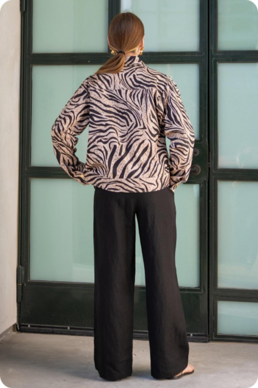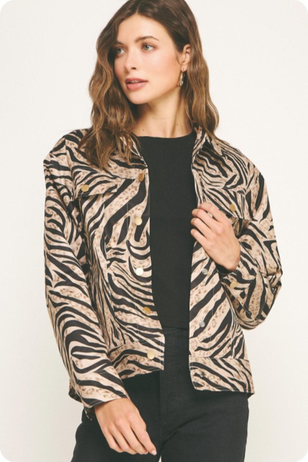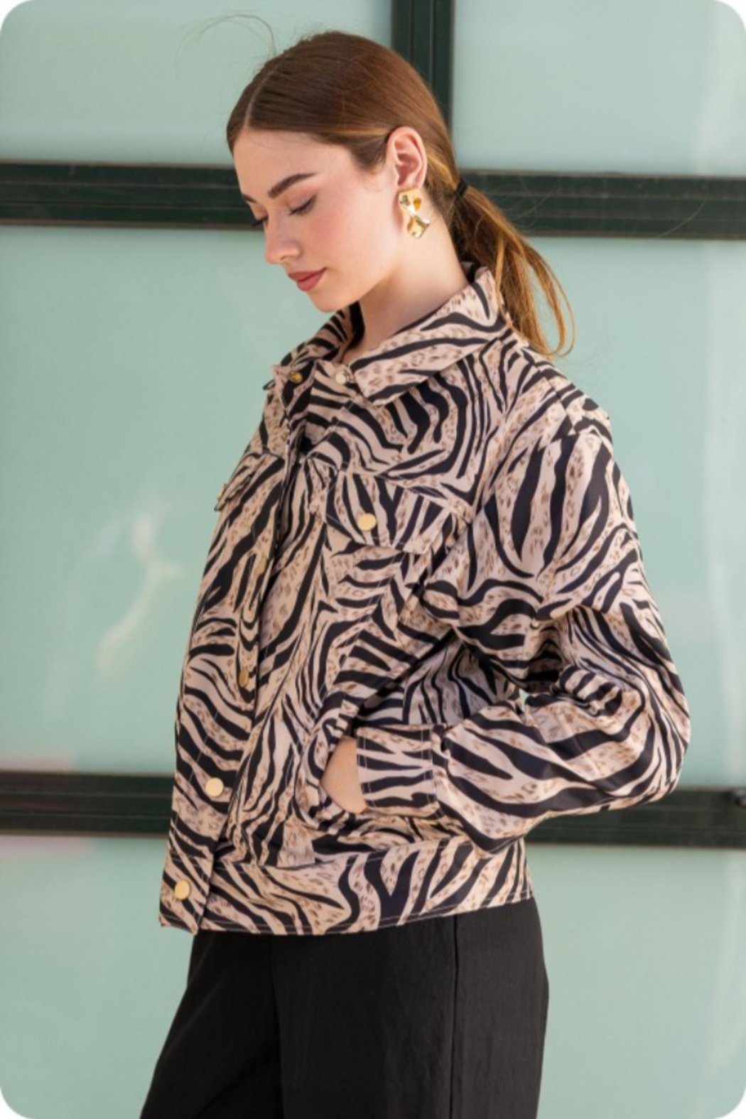 This shacket style features a collared neckline, drop shoulder, functional flap chest pockets with button closure, button down closure at the front, side pockets, and a relaxed fit. This jacket is intended to hit at the waistline.