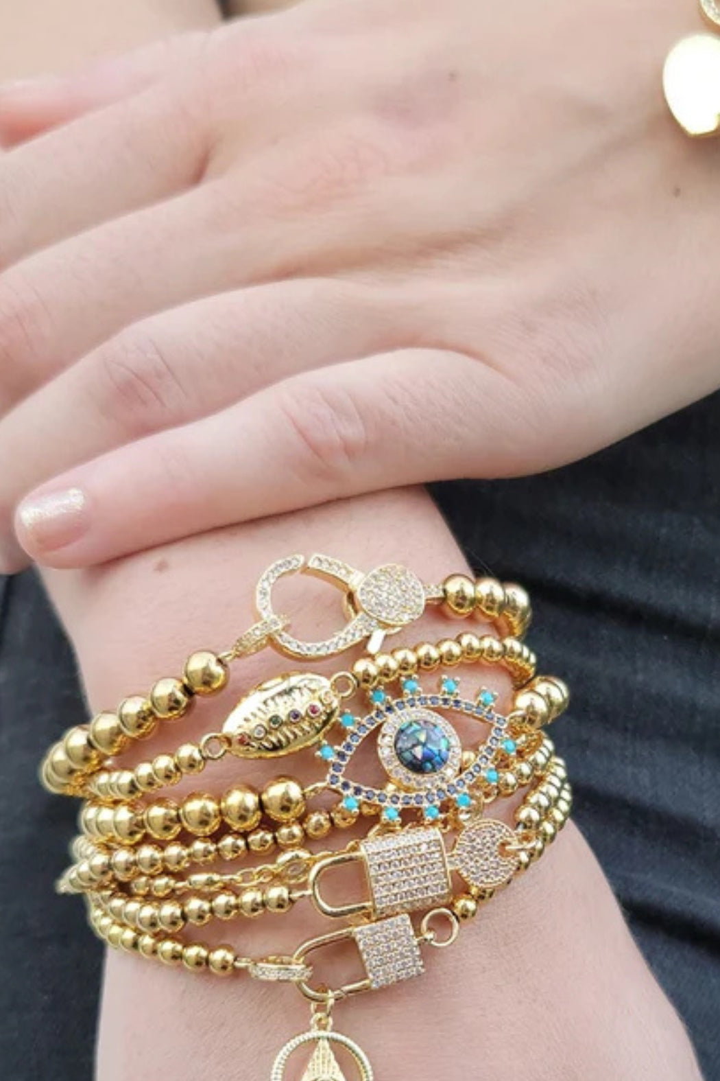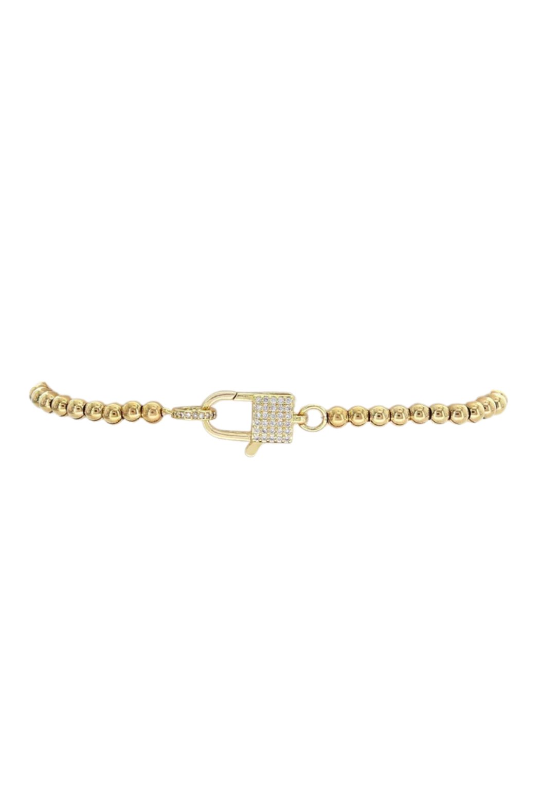 Beaded stainless steel stretch bracelet with micro pavè cubic zirconia rings attached to micro pavè cubic zirconia clasp.