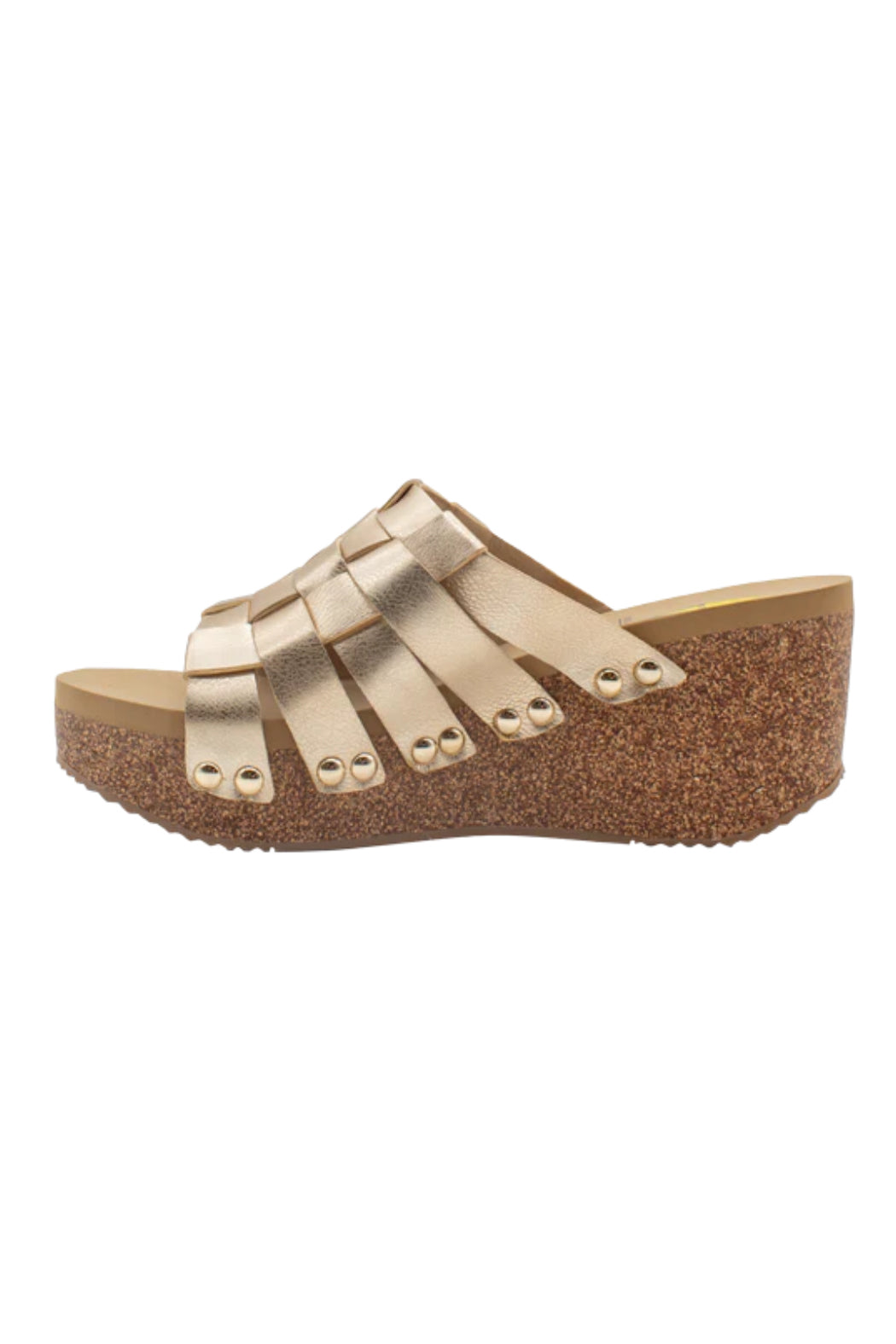 The Enoki woven slide wedge from Volatile offers a stylish blend of texture and sophistication, featuring a beautifully crafted woven upper adorned with metal clog stud accents for a touch of edgy detail. The sandal sits atop a natural cork wedge, providing a comfortable lift, while the signature comfort EVA insole ensures all-day cushioning and support. Perfect for elevating any casual or dressy look, the Enoki sandal effortlessly combines modern design with lasting comfort.