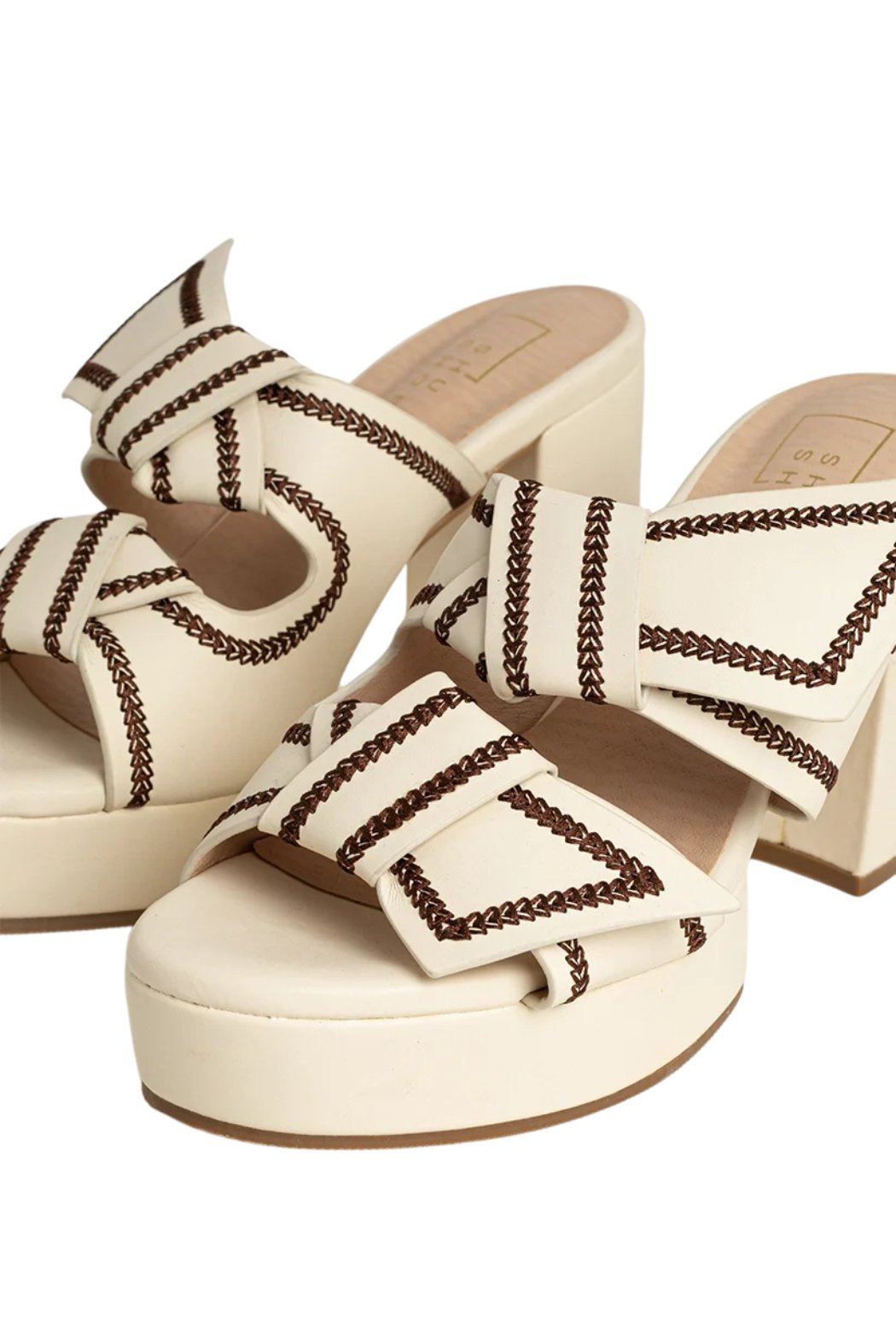 Sweet and striking. The HONEY in Bone brings bold retro energy to your step with oversized double bows, contrast trim, and a chunky block heel that turns heads. Crafted in smooth faux leather and set on a platform sole, this slip-on style is as comfortable as it is eye-catching. It’s the kind of heel that instantly upgrades everything from wide-leg pants to summer dresses. Playful yet polished-just the way we like it.