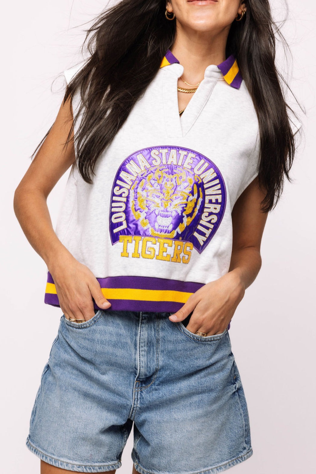 Stripe collared Licensed LSU tank top.