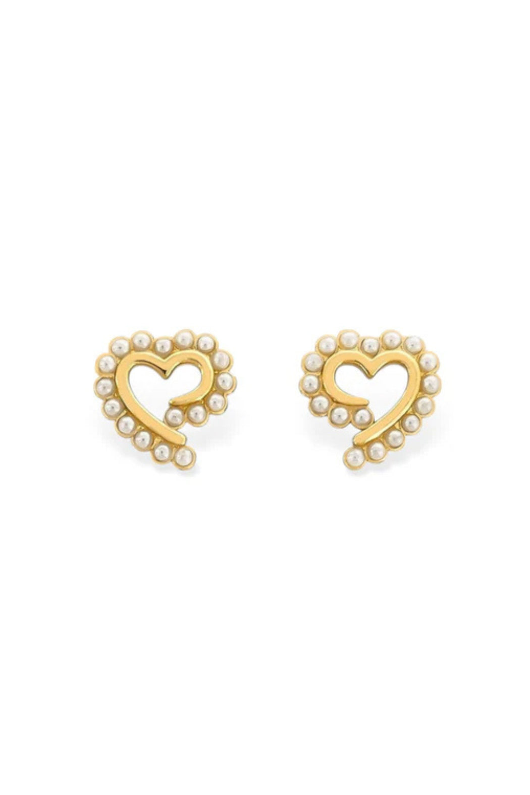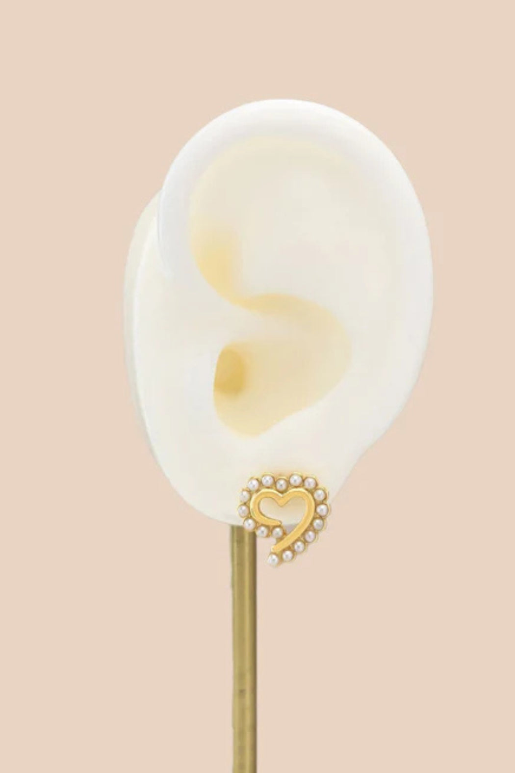Pearl Heart Stud Earrings These heart stud earrings are a sweet whisper of elegance, framed with a delicate halo of freshwater pearls. Their charming shape feels like a love note: light, graceful, and effortlessly enchanting. Material: 18k gold plated, triple plated Stone: Freshwater pearls Measurements: Approx. 12mm Closure: Push back FINAL SALE