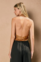Shimmering metallic bodysuit featuring an open back and front crossed halter neck. Model is 5'9" and wearing size Small.