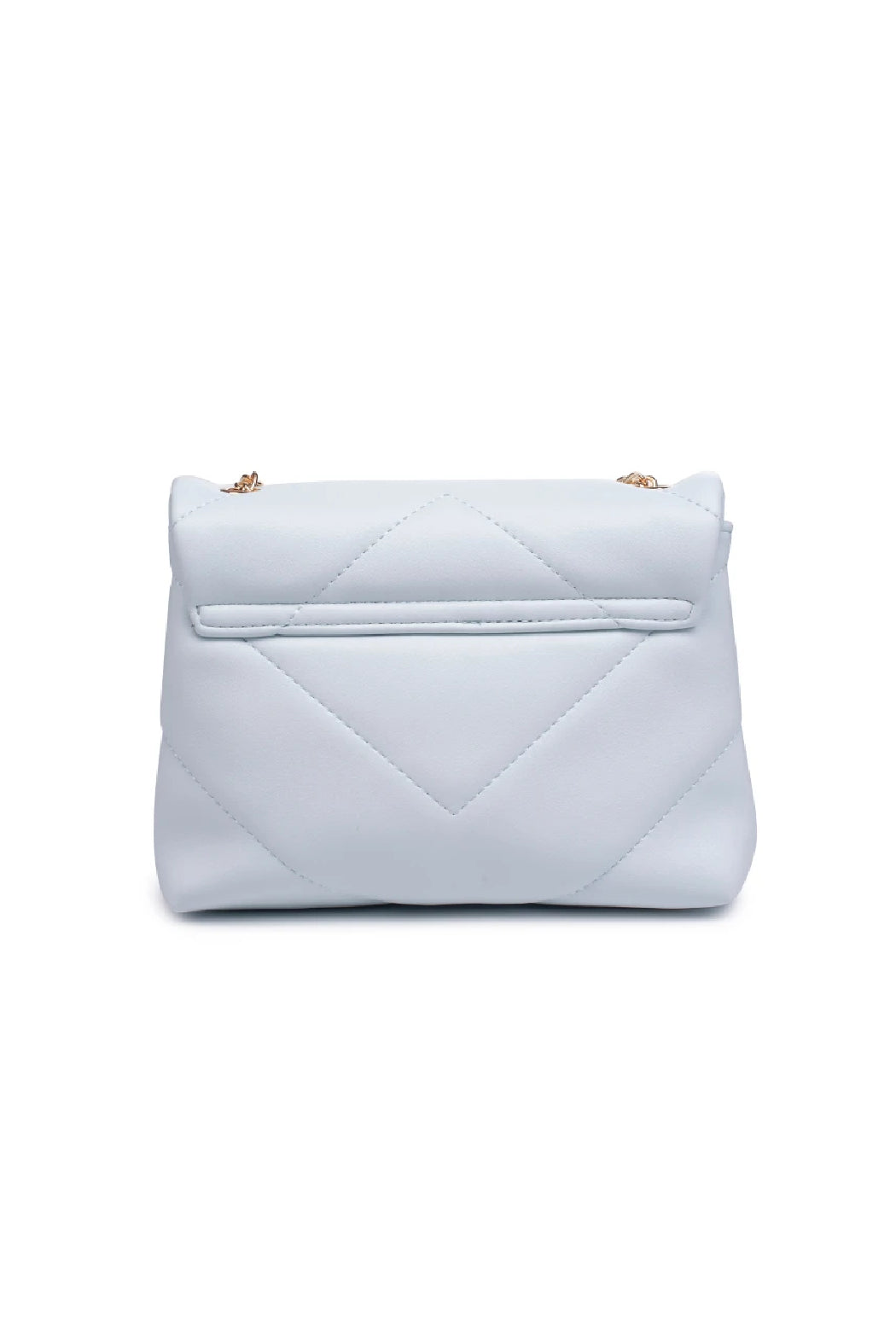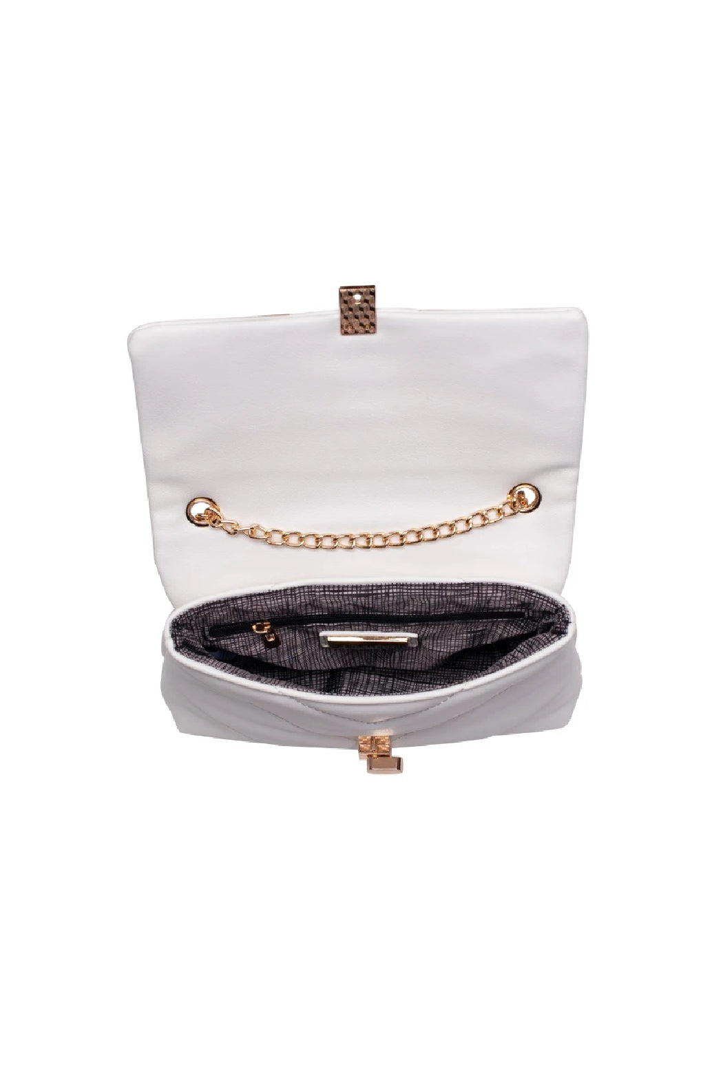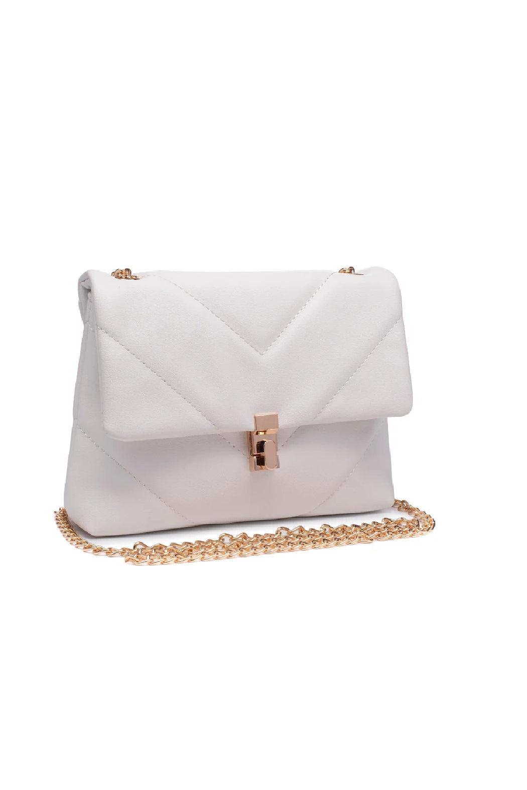 Exterior Details: Quilted design, foldover flap, gold lock + hardware details
