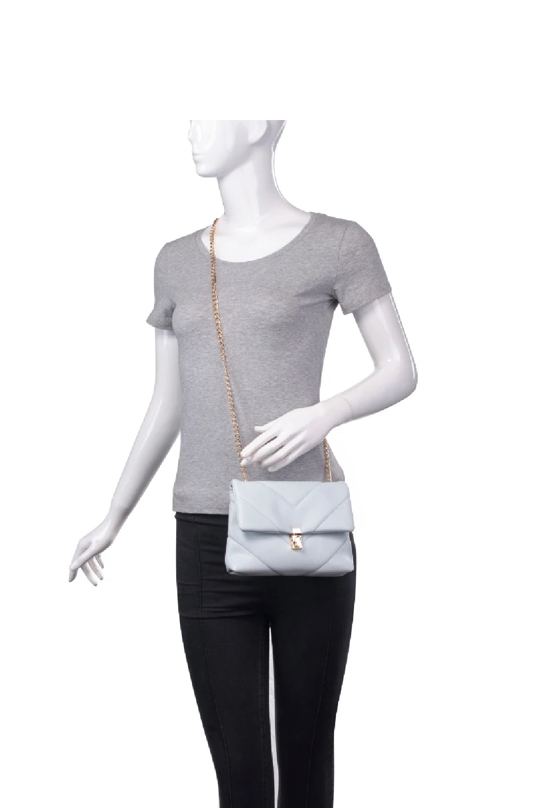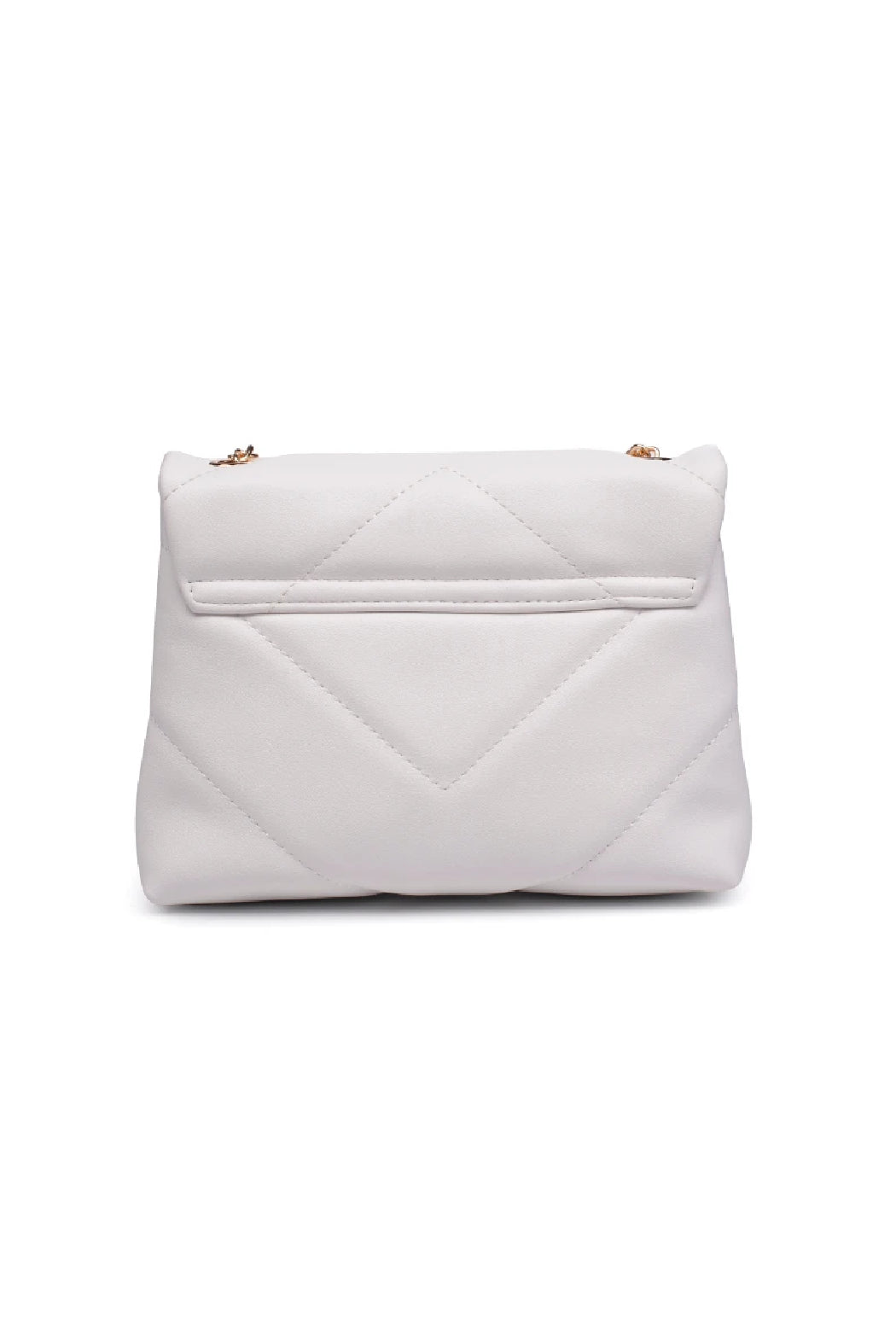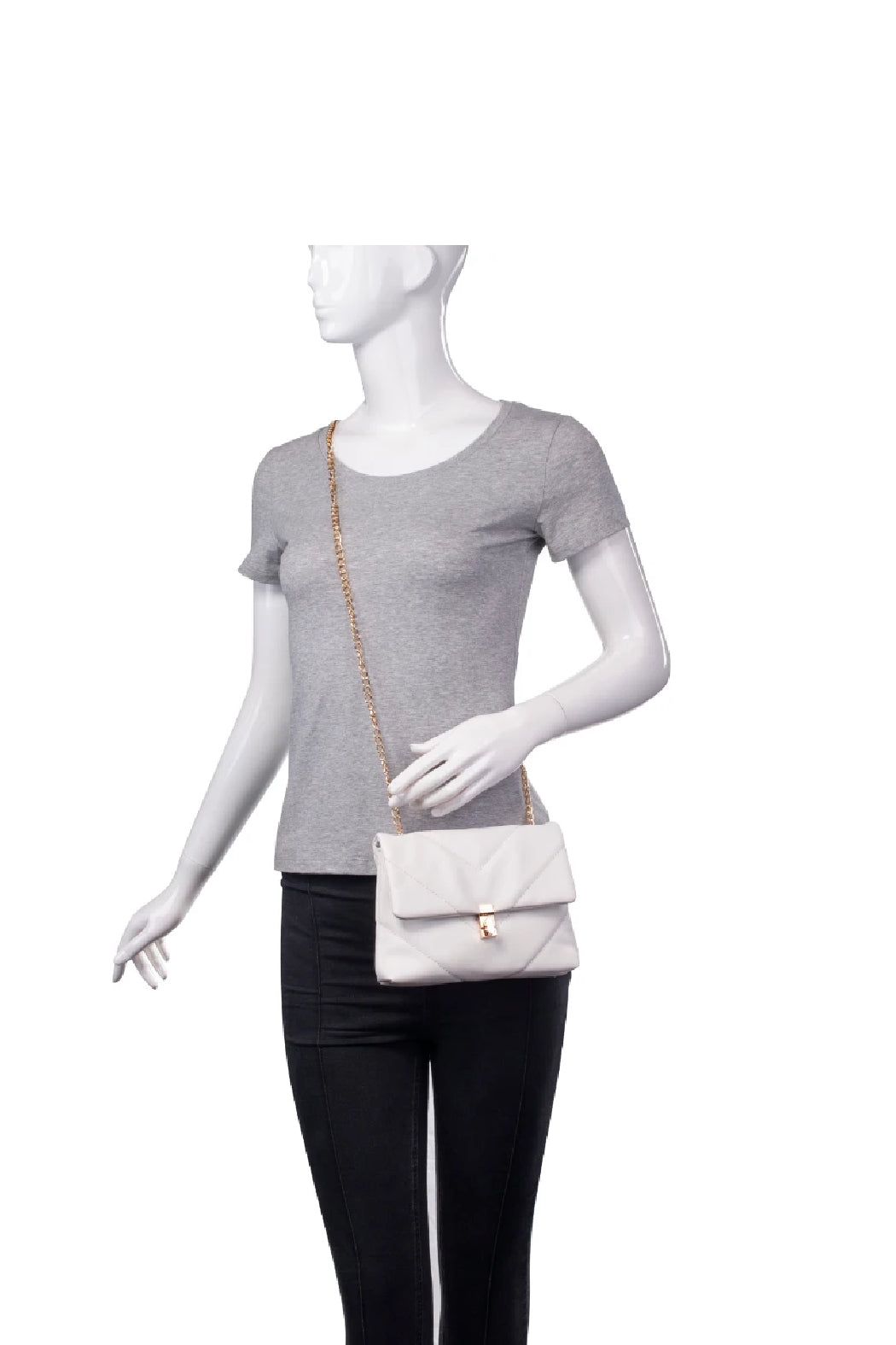 Exterior Details: Quilted design, foldover flap, gold lock + hardware details