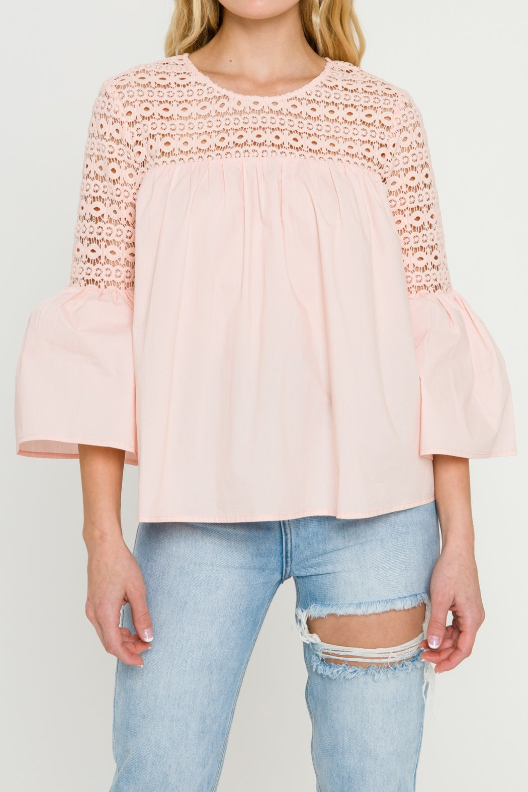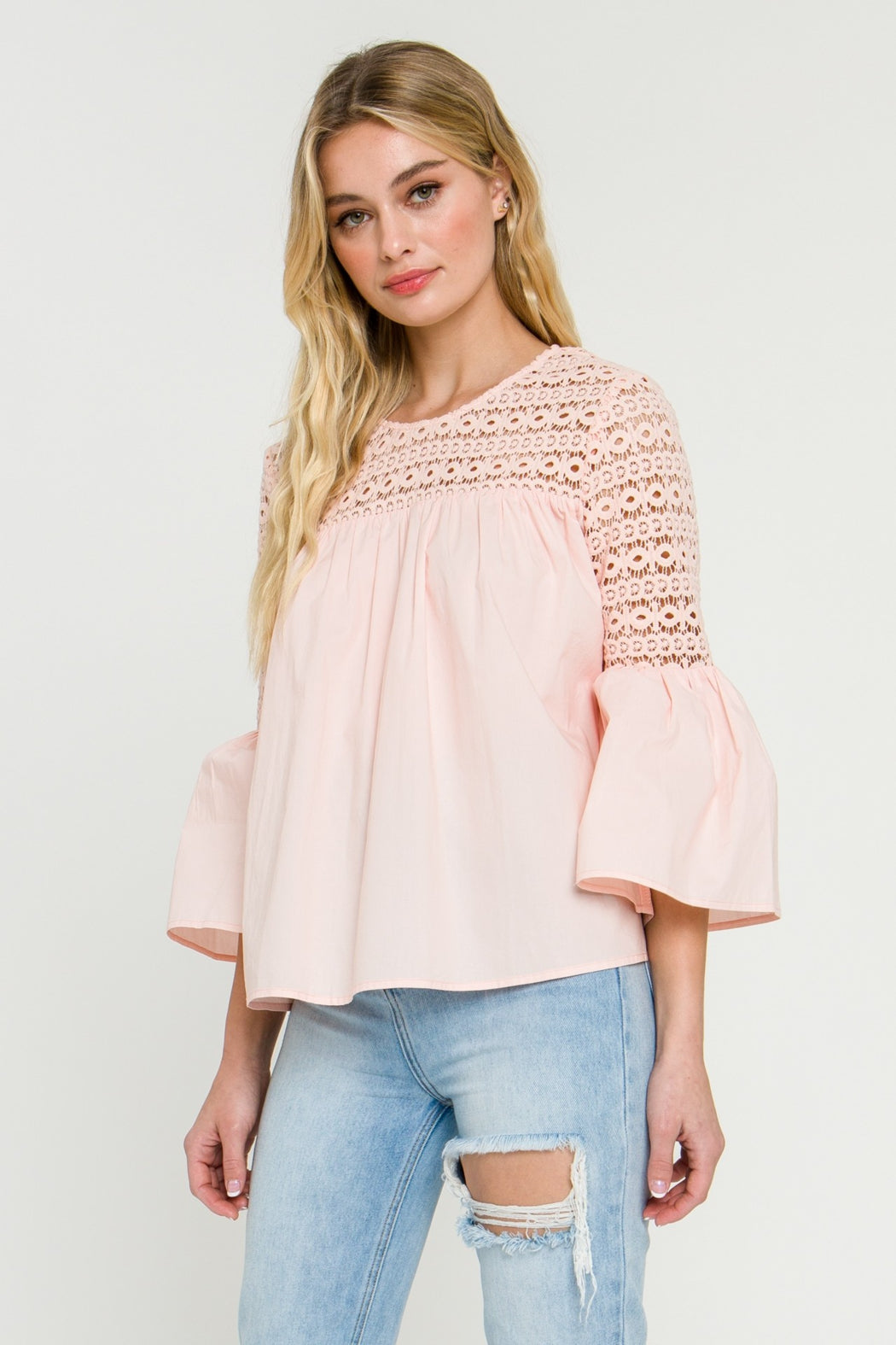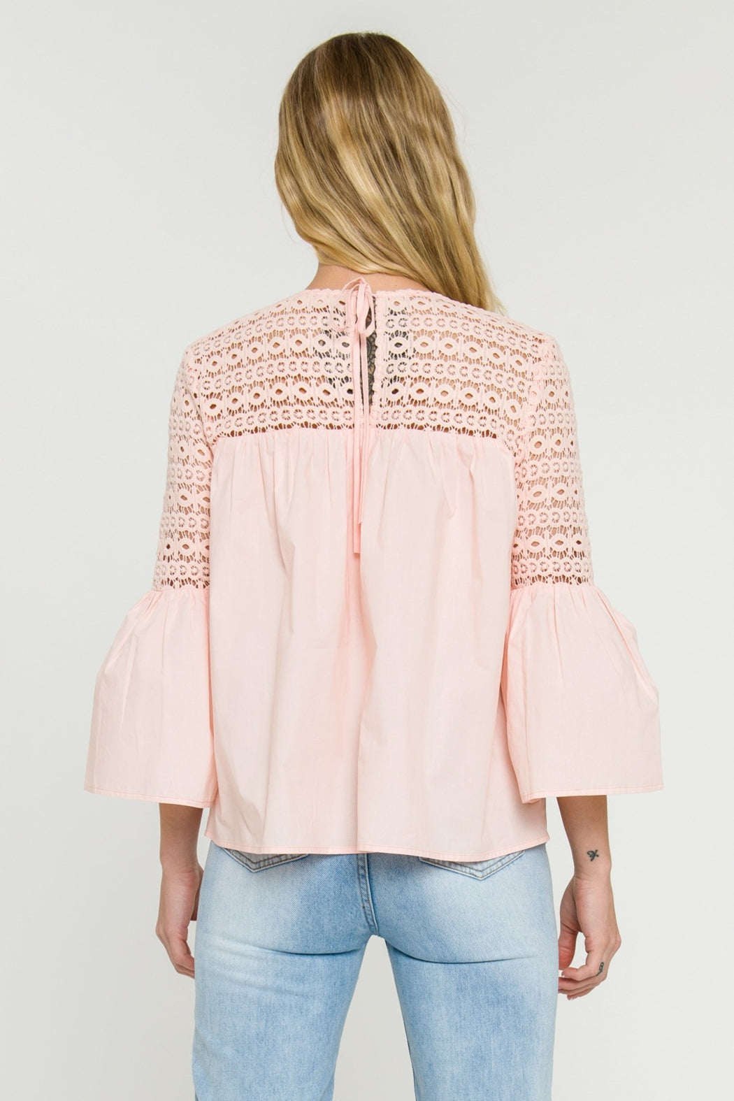 Poplin bell sleeve blouse with crochet lace contrast neckline.