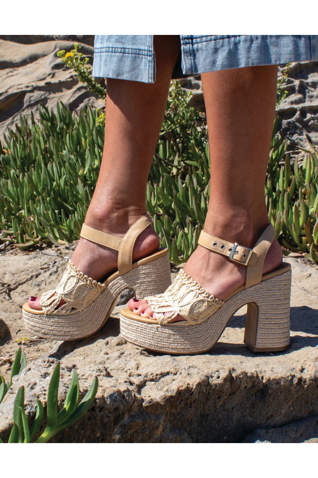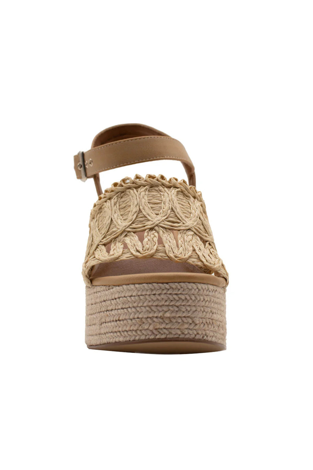 Woven raffia vamp with matching faux leather ankle strap and metal buckle closure