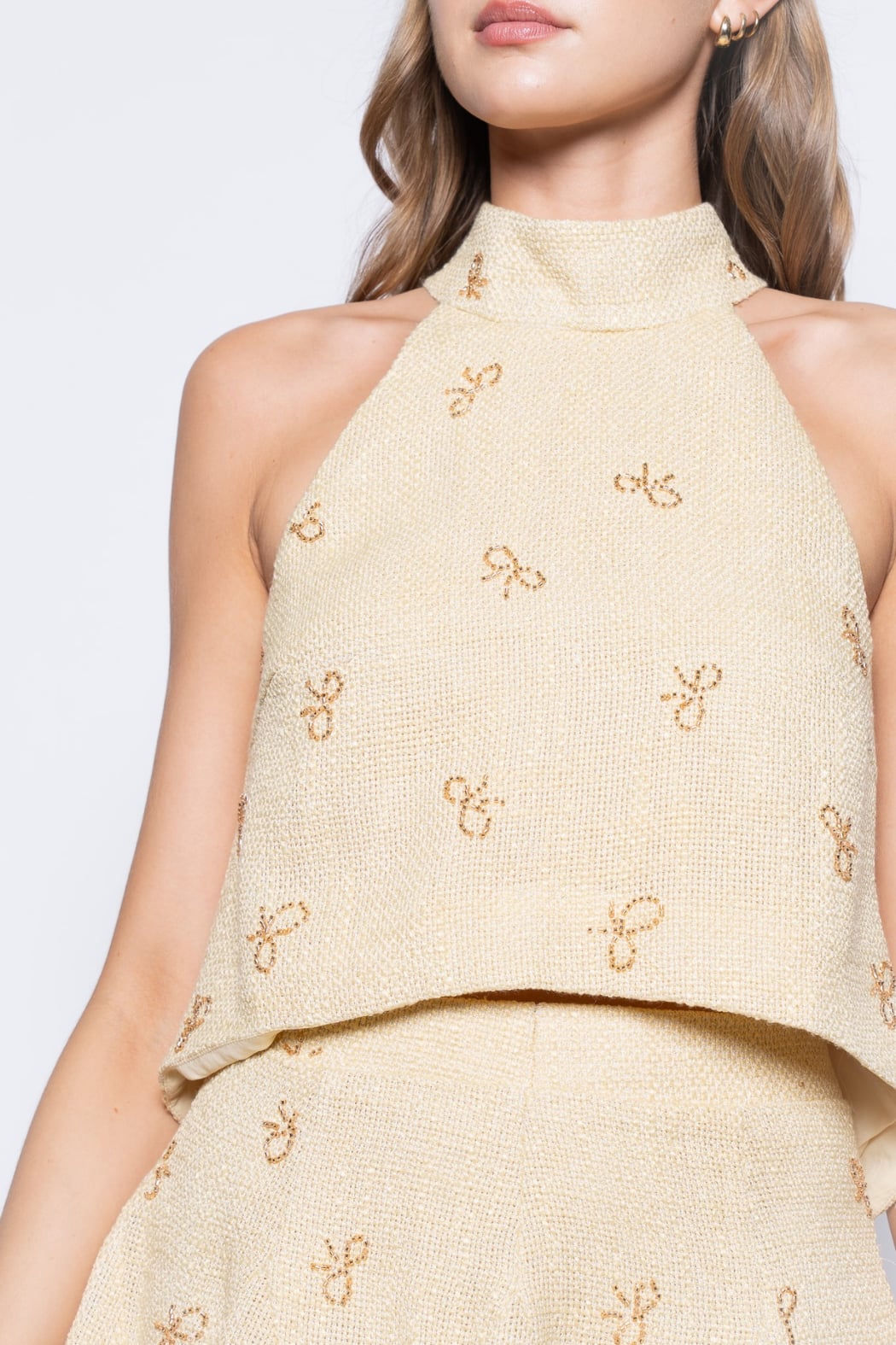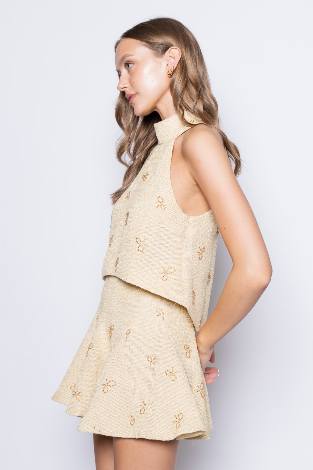 Embrace a refined, feminine touch with this Chic Classy Mock Neck Bow Tweed Tank Top, designed to bring timeless elegance to any wardrobe. The structured mock neckline creates a clean, sophisticated frame, while the sleeveless silhouette keeps the look modern and versatile for layering or solo wear. Delicate beaded bow accents add a charming yet polished statement, perfectly complementing the richness of the tweed fabric. Its semi-cropped high-low hem introduces a subtle touch of drama and pairs beautifully with tailored trousers, high-waisted skirts, or sleek denim. A hidden side zipper ensures a streamlined fit, allowing the top to maintain its structured shape. Whether styled for an elevated daytime outing or a chic evening look, this piece delivers effortless luxury.