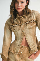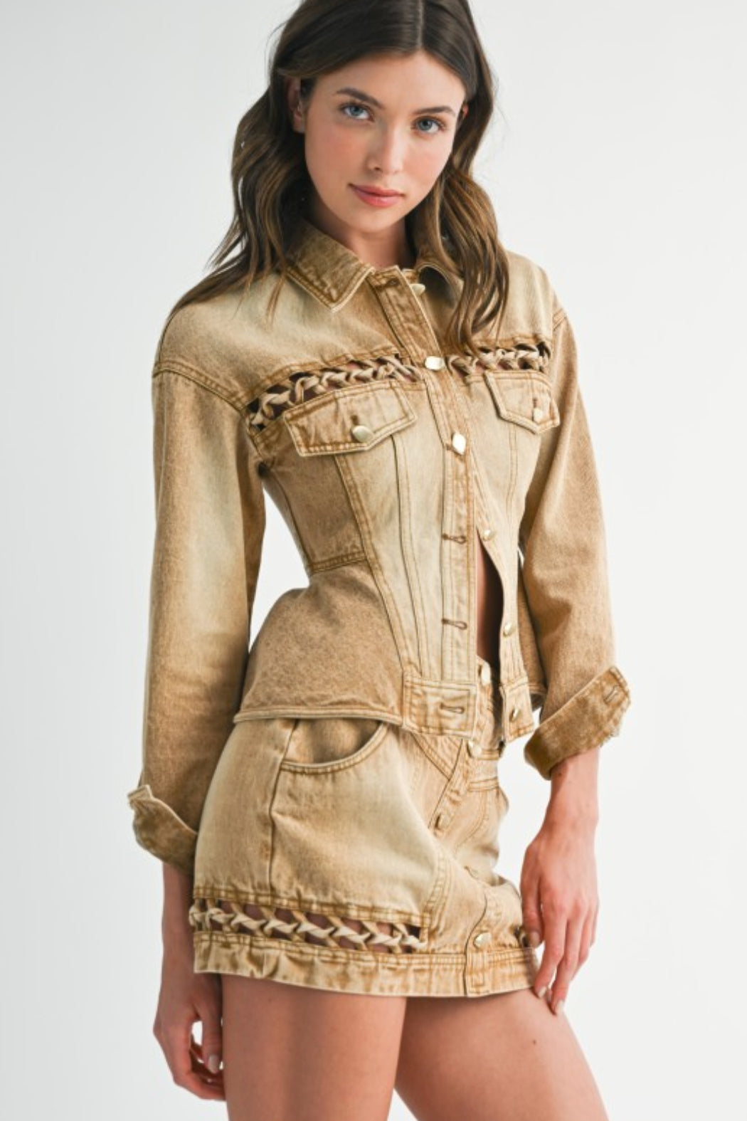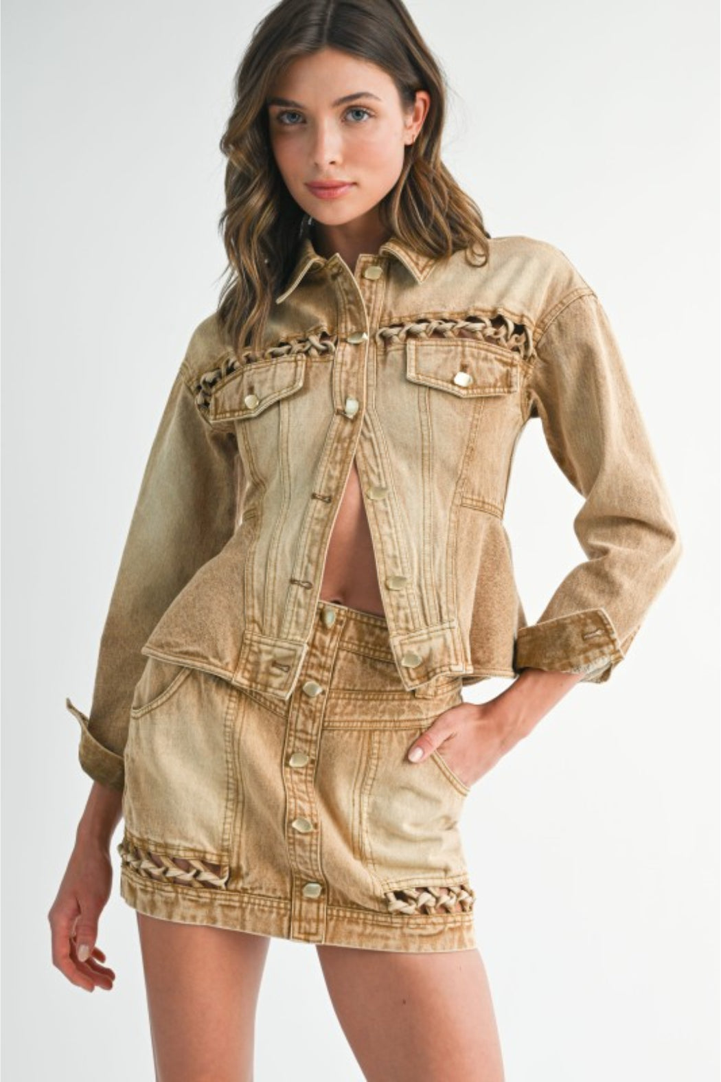 This denim jacket features a golden brown, faded wash, with a collared neckline, long sleeves, and gold button closures. The fitted bodice cinches at the waist, flaring into a peplum-style hem. Braided detailing decorates the upper chest, while two buttoned flap pockets add a classic touch. Its structured silhouette blends timeless denim with feminine flair. Fabric Contents 80% Cotton 20% Polyester Made in China