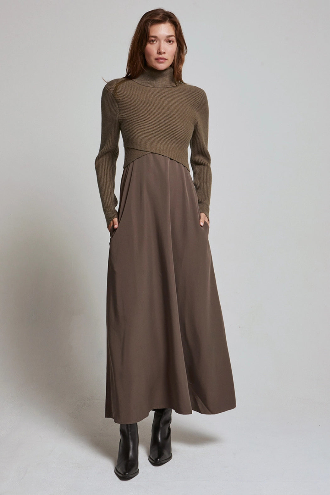 Brooks Dress & Sweater Two-Piece Set Top: - V-shaped crossover hem - Cropped length - Turtle neck - Long sleeves - Rib knit Dress: - Contrasting fabric details - Maxi length - Hidden side zipper (wearer’s left) - Hidden side pockets - Model is wearing size small SELF: 77% Acrylic, 20% Nylon, 3% Spandex CONTRAST 1: 77% Rayon, 23% Polyester CONTRAST 2: 95% Rayon, 5% Spandex