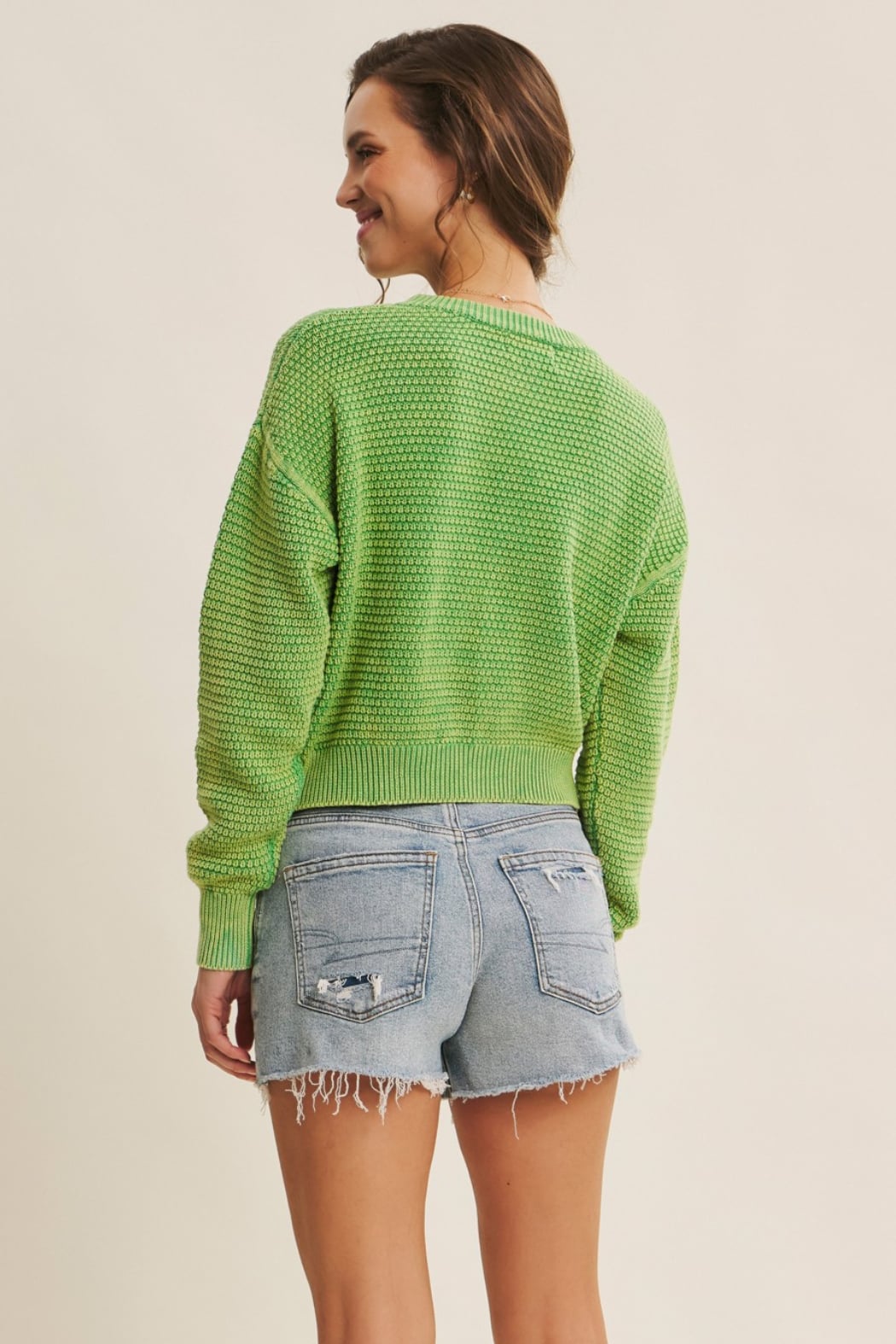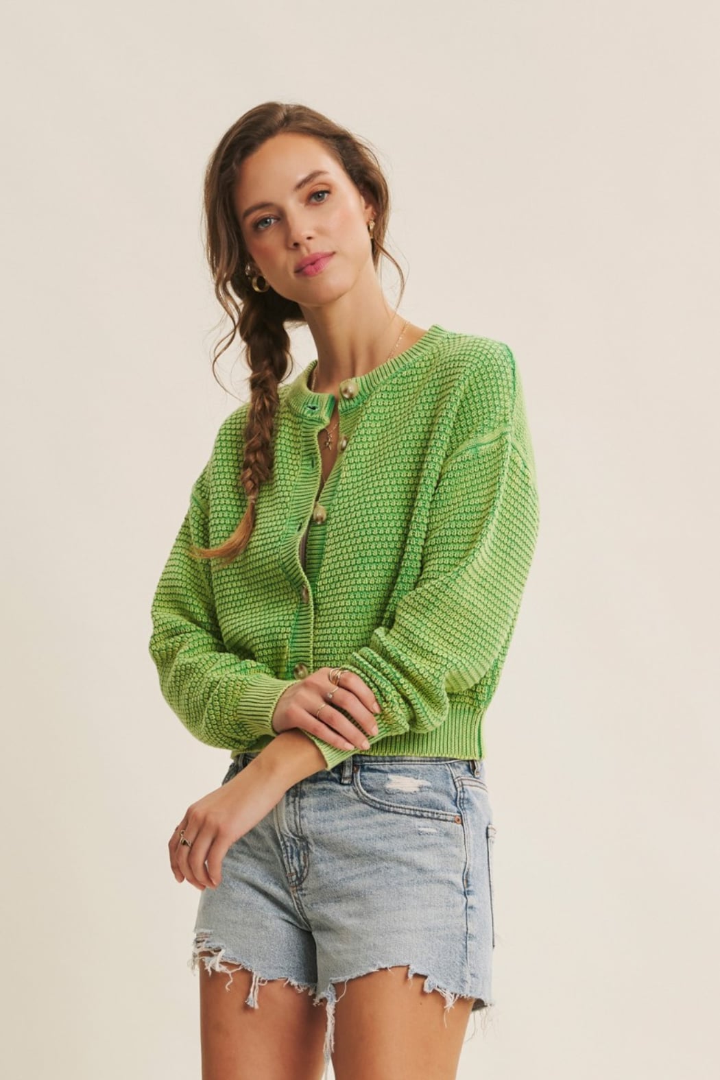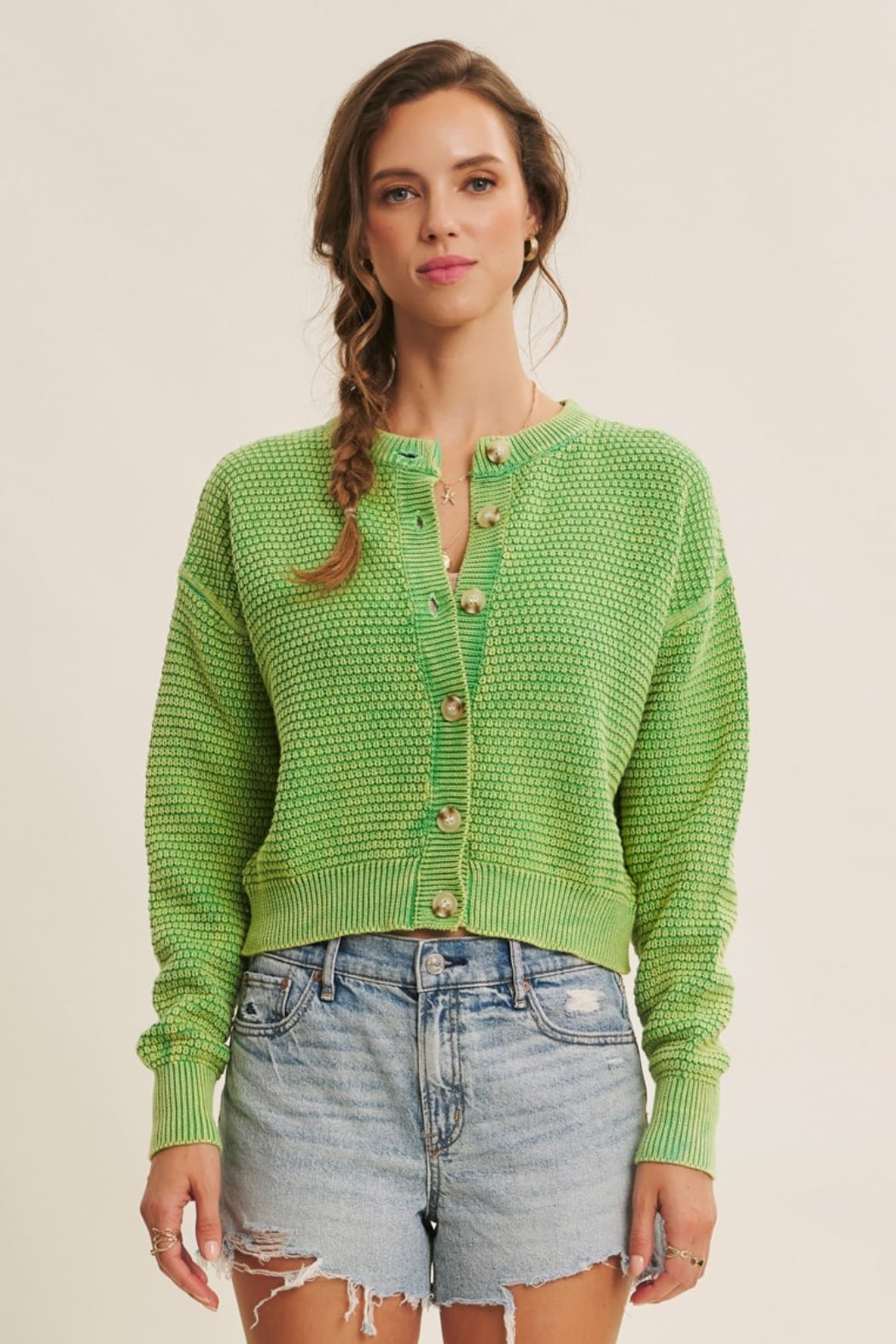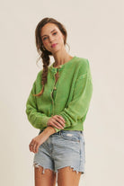 Mineral-washed cotton knit cardigan with button-down front, ribbed neckline, placket, cuffs, and long sleeves. Relaxed fit for layering.