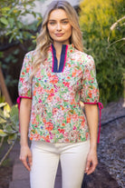 Floral print short sleeve top featuring a split neckline with contrast trim and adjustable sleeve ties for a feminine touch. Designed in a lightweight woven fabric with a relaxed fit, this colorful spring and summer style is perfect for easy boutique styling and everyday wear