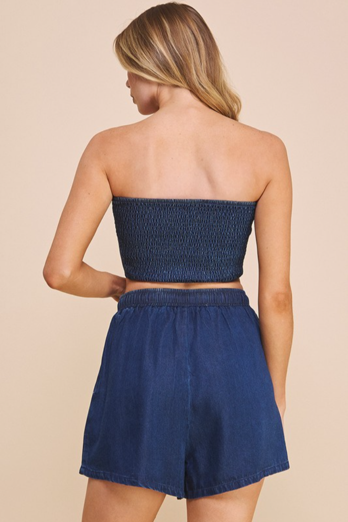 Washed Chambray Denim Fitted Tube Smocked Back Top