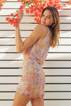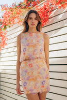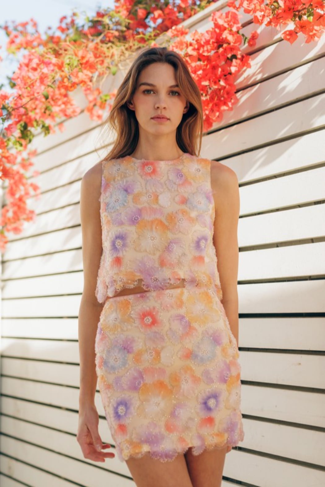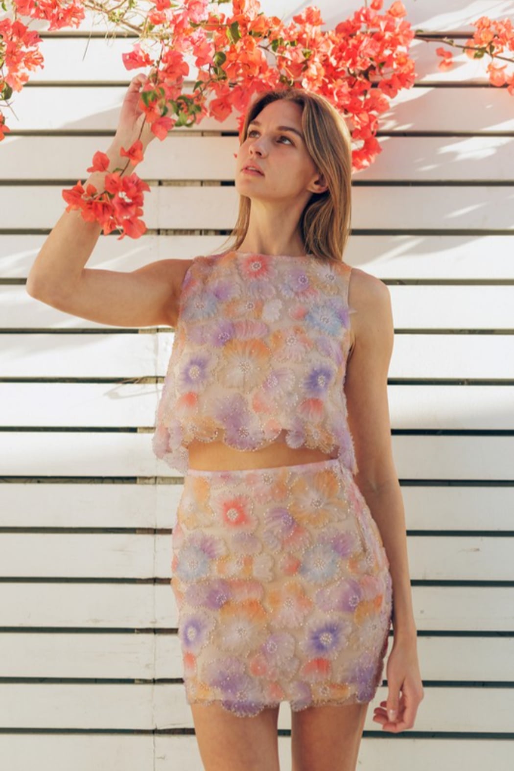 This mini pencil skirt showcases vibrant, embellished floral designs, creating a bold and stylish statement. Its fitted silhouette offers a sleek and structured look, perfect for a polished outfit. Pair it with the matching tank top for a cohesive ensemble or mix and match with other pieces to suit your personal style. Fabric Contents 100% POLYESTER