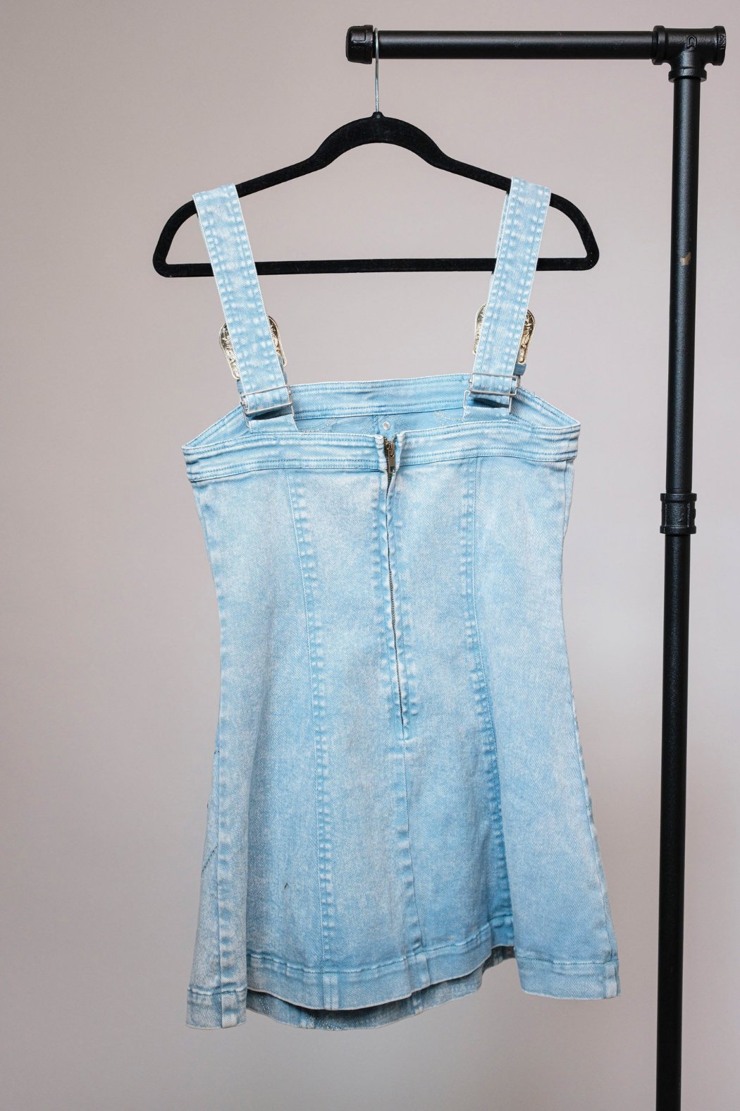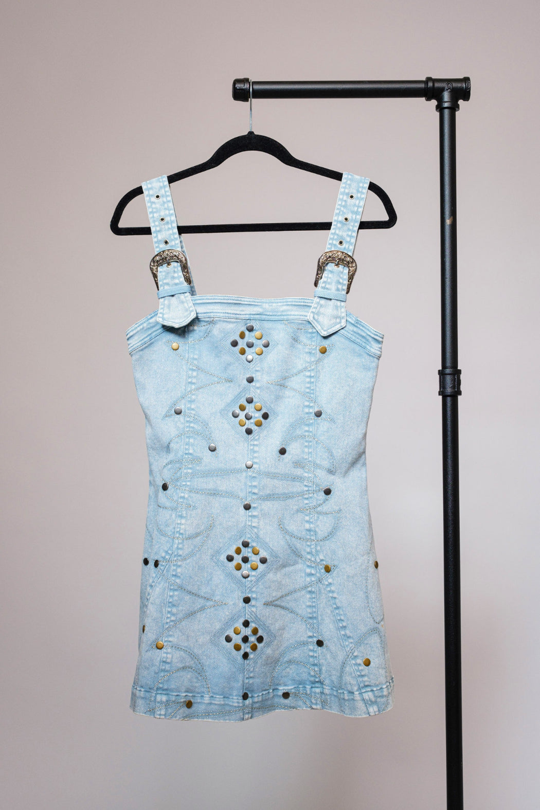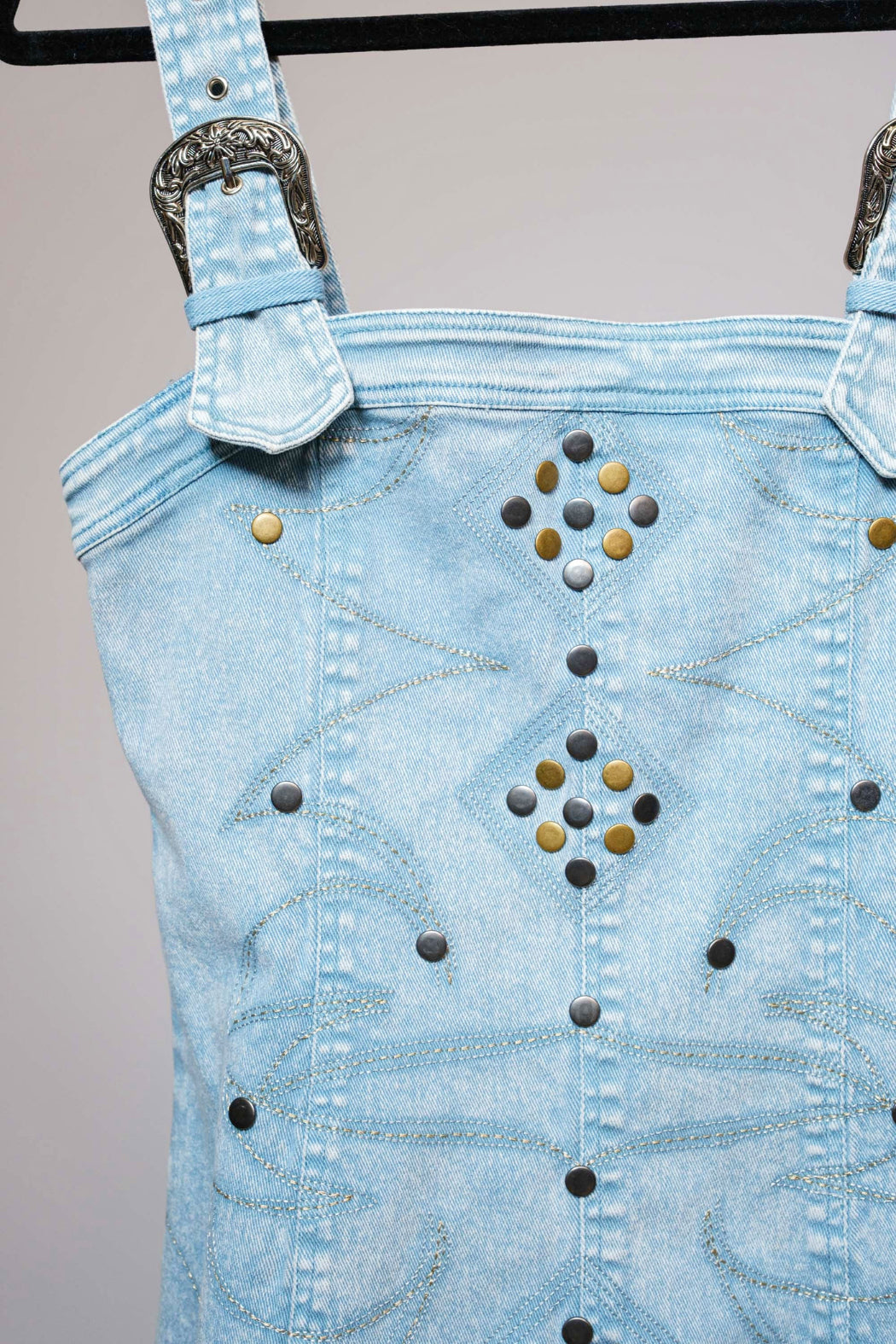 Features studded details, western-inspired stitchwork, and buckle shoulder straps. Made with stretch denim for comfort and a flattering fit.