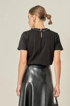 Round neckline Short sleeves Bow detail with flower trim Back keyhole and button closure Ribbed Hand wash cold Do not bleach Do not tumble dry Iron low Shell: 100% Cotton Contrast: 91% Cotton, 9% Spandex BLACK: Height 5'9" / Bust 31.5" / Waist 23.5" / Hip 33.5"
