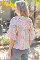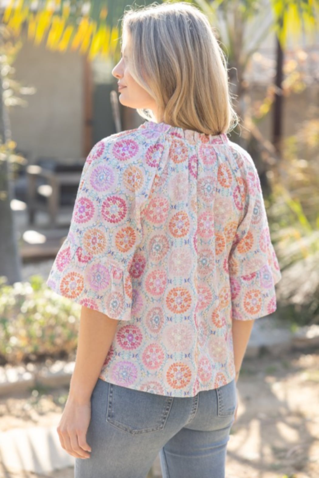 A lightweight boho-inspired top featuring a colorful embroidered floral print, flutter sleeves, and a soft ruffled neckline with ties. Easy, breezy, and perfect for spring/summer