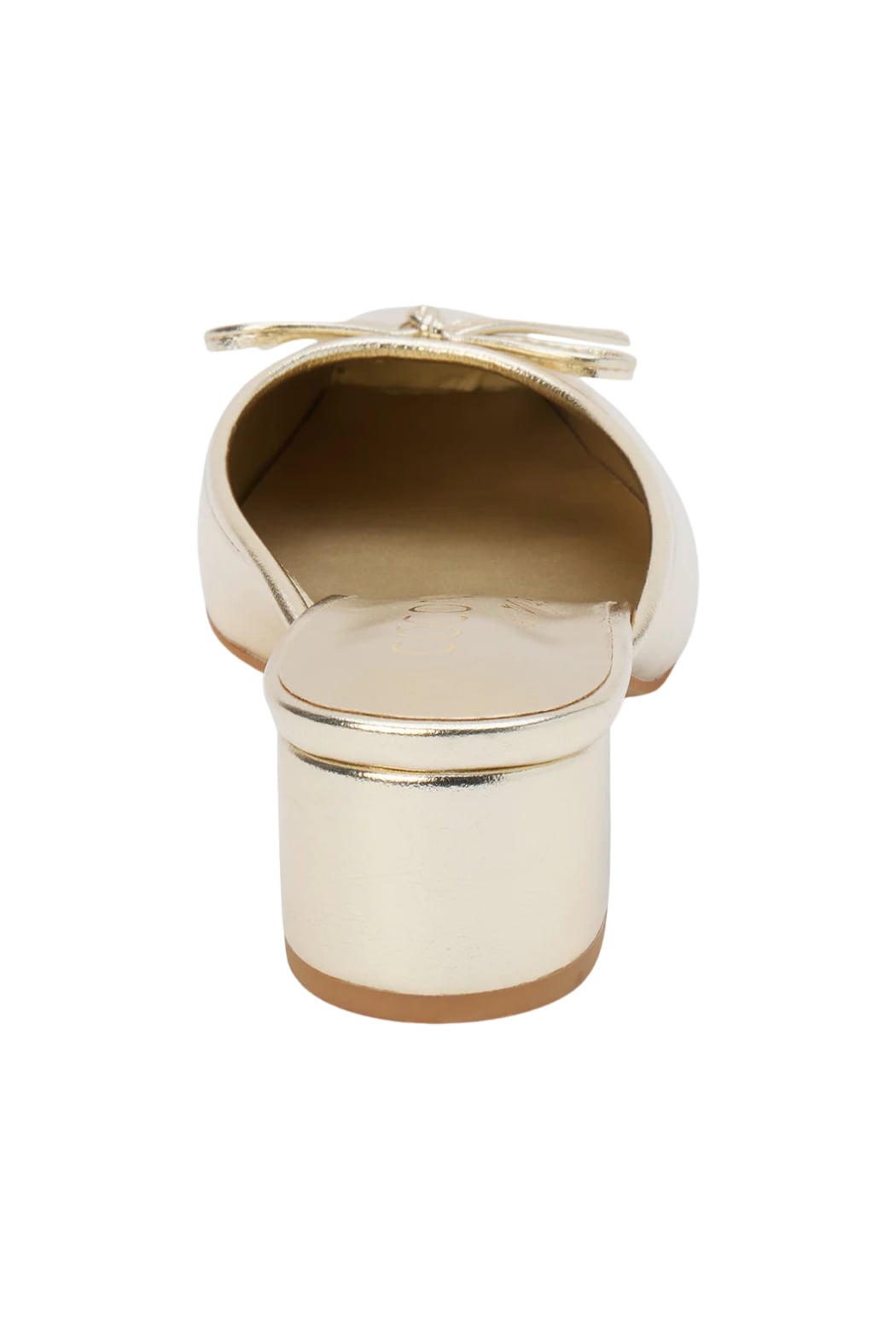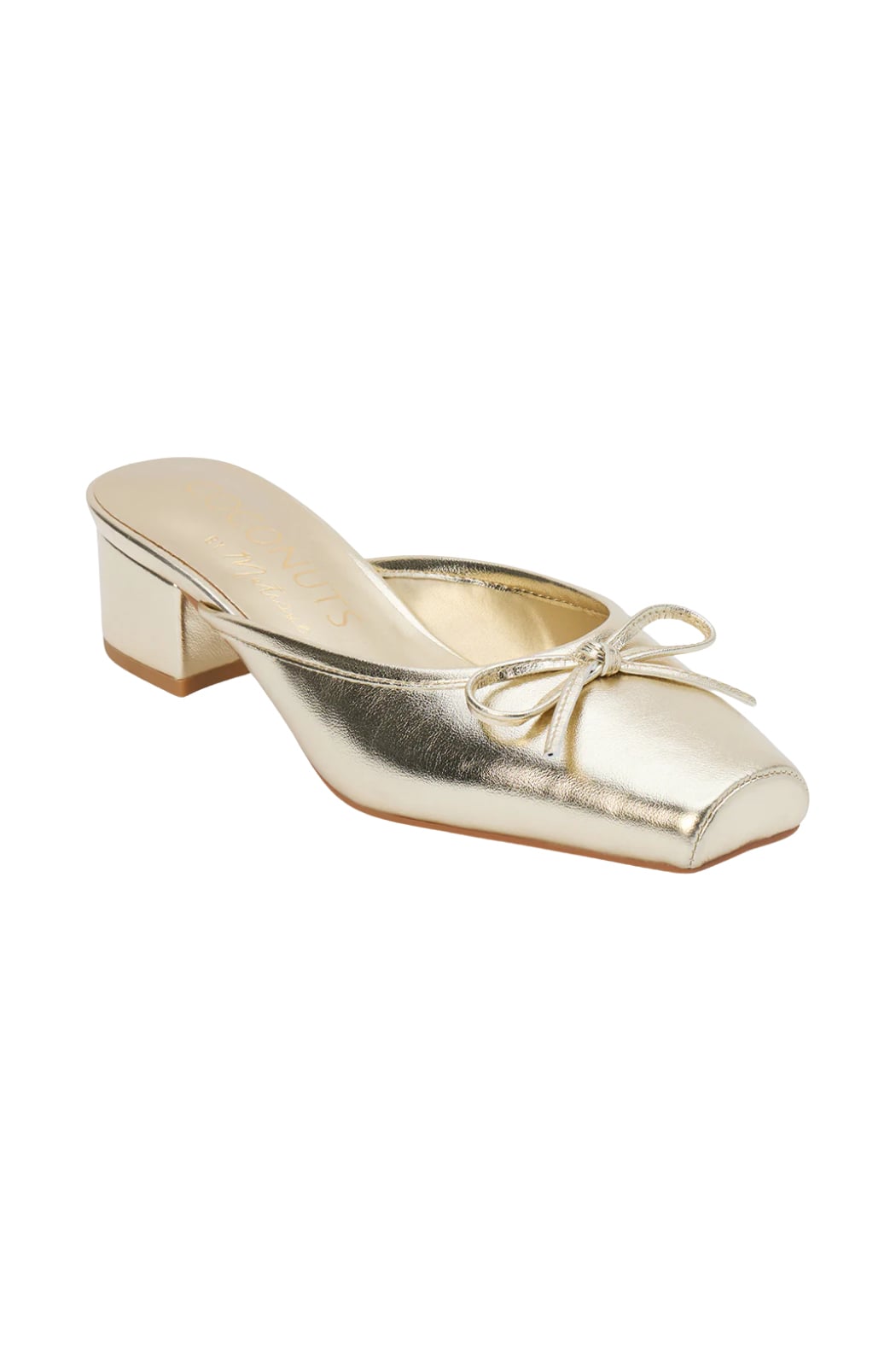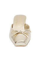 Faux leather mule with a square toe, low block heel, and delicate bow detail.