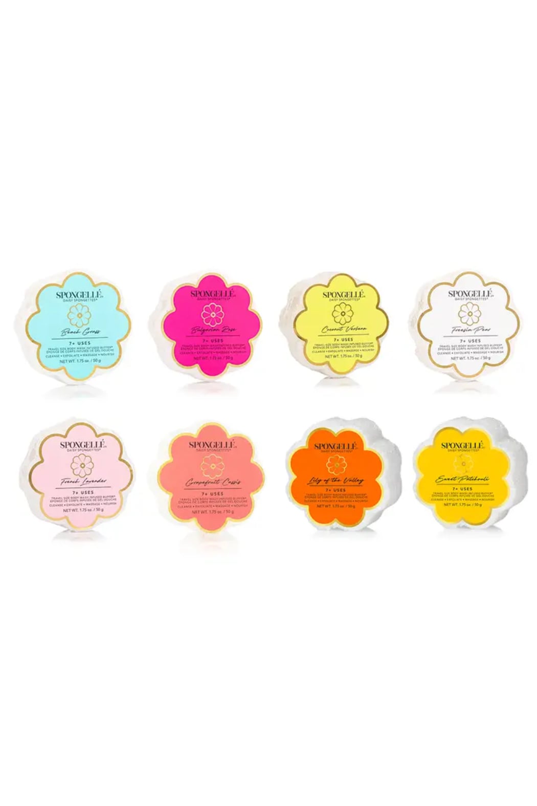 Everything you love about Spongellé® in a convenient travel-size Spongette meets Daisy Collection’s signature flower design infused with more washes. Accepted on all airlines, leak-proof, easy to carry, and everything you need for soft and radiant skin. Enjoy our assortment of eight travel-friendly blends in Bulgarian Rose, Beach Grass, Coconut Verbena, French Lavender, Freesia Pear, Grapefruit Cassis, Lily of the Valley, and Sweet Patchouli to spruce up any vacation or trip to the gym. Good for 7+ washes per buffer. Made in United States Production Cruelty-free