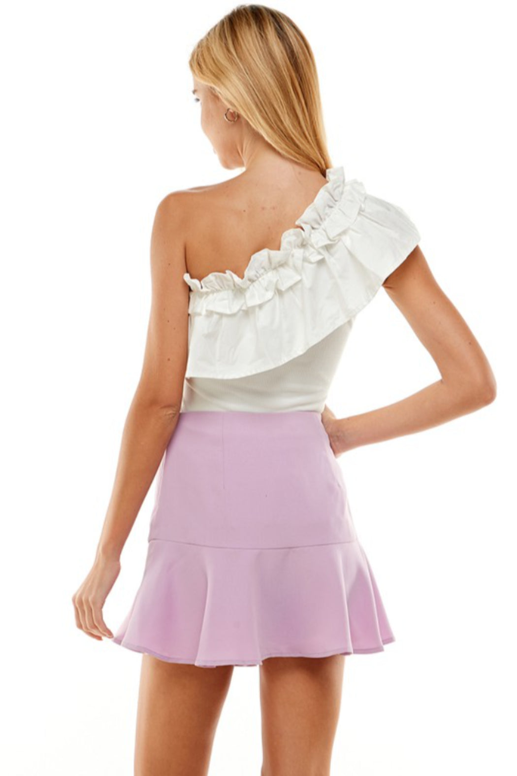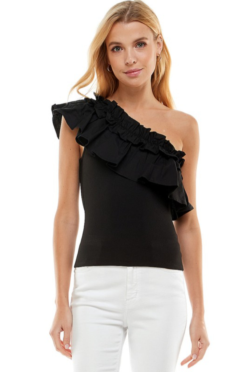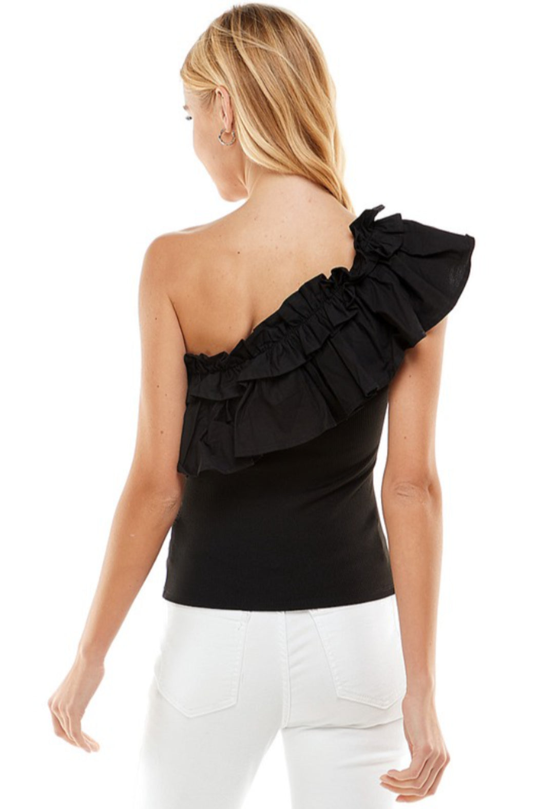 One shoulder top with a form fitting silhouette and a ruffle across the neckline.