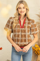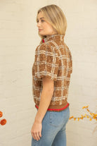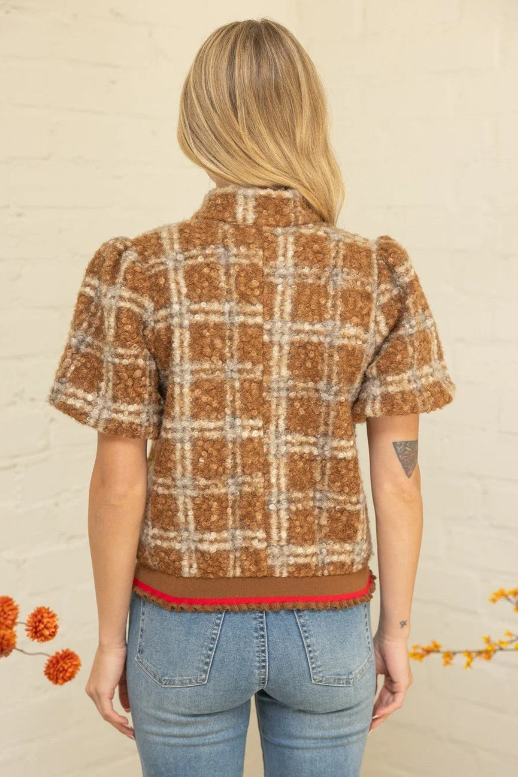 Cozy meets chic in the Plaid Sherpa Trim Top. Featuring a textured plaid sherpa body with contrast striped trim at the neckline and hem, this piece blends warmth with standout style. The relaxed fit and soft lining make it perfect for cooler days without sacrificing comfort. Key Features:  • Textured plaid sherpa fabric  • Striped contrast trim at neckline and hem  • Short sleeves with subtle volume  • Soft lining for added comfort  • Pullover style Model Information:  Model is 5'8" and wearing a size Small. Fabric Content:  Self: 90% Polyester, 5% Wool, 5% Acrylic  Contrast: 95% Cotton, 5% Spandex  Lining: 100% Polyester