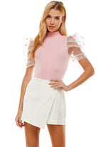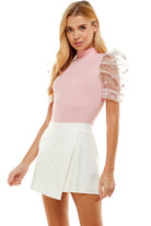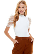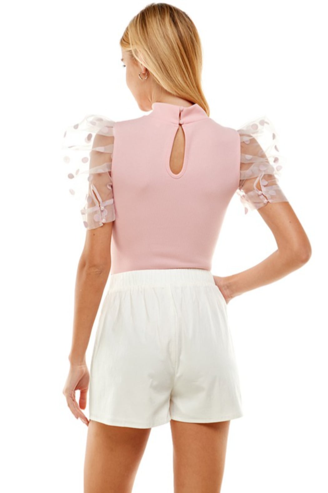 A knit bodysuit featuring a mock neckline, short organza puff sleeve with polka dot printed and back keyhole with button closures.