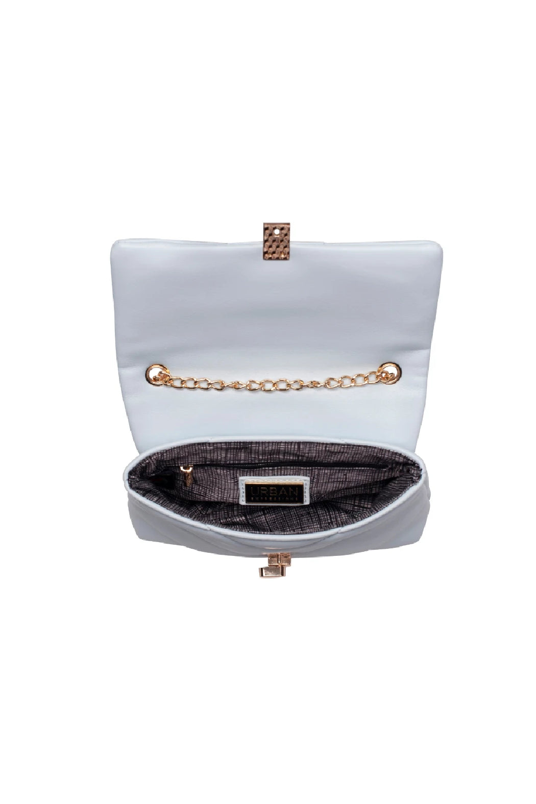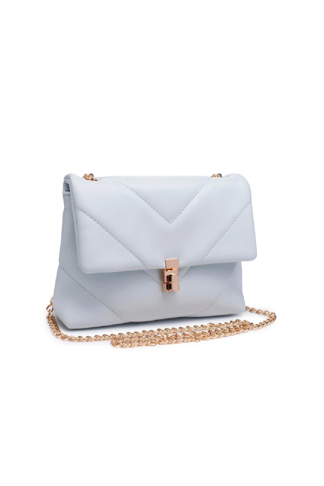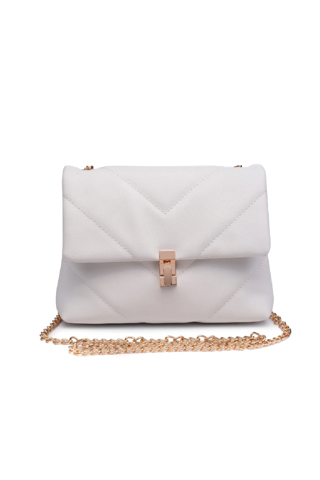 Exterior Details: Quilted design, foldover flap, gold lock + hardware details