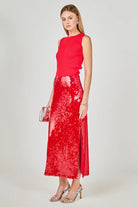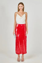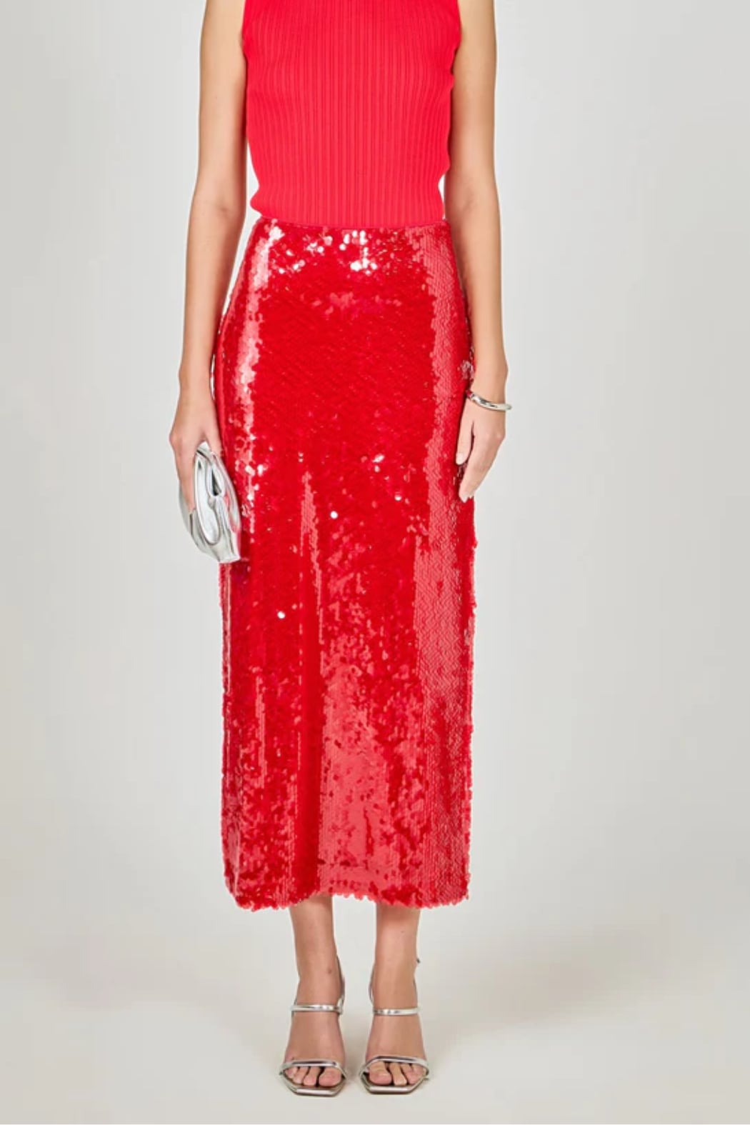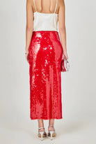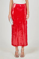 Sequin maxi skirt Straight silhouette Hand wash cold Do not bleach Do not tumble dry Do not iron Do not dry clean Self: 100% Polyester Lining: 100% Polyester Height 5'10" / Bust 34" / Waist 26" / Hip 36"