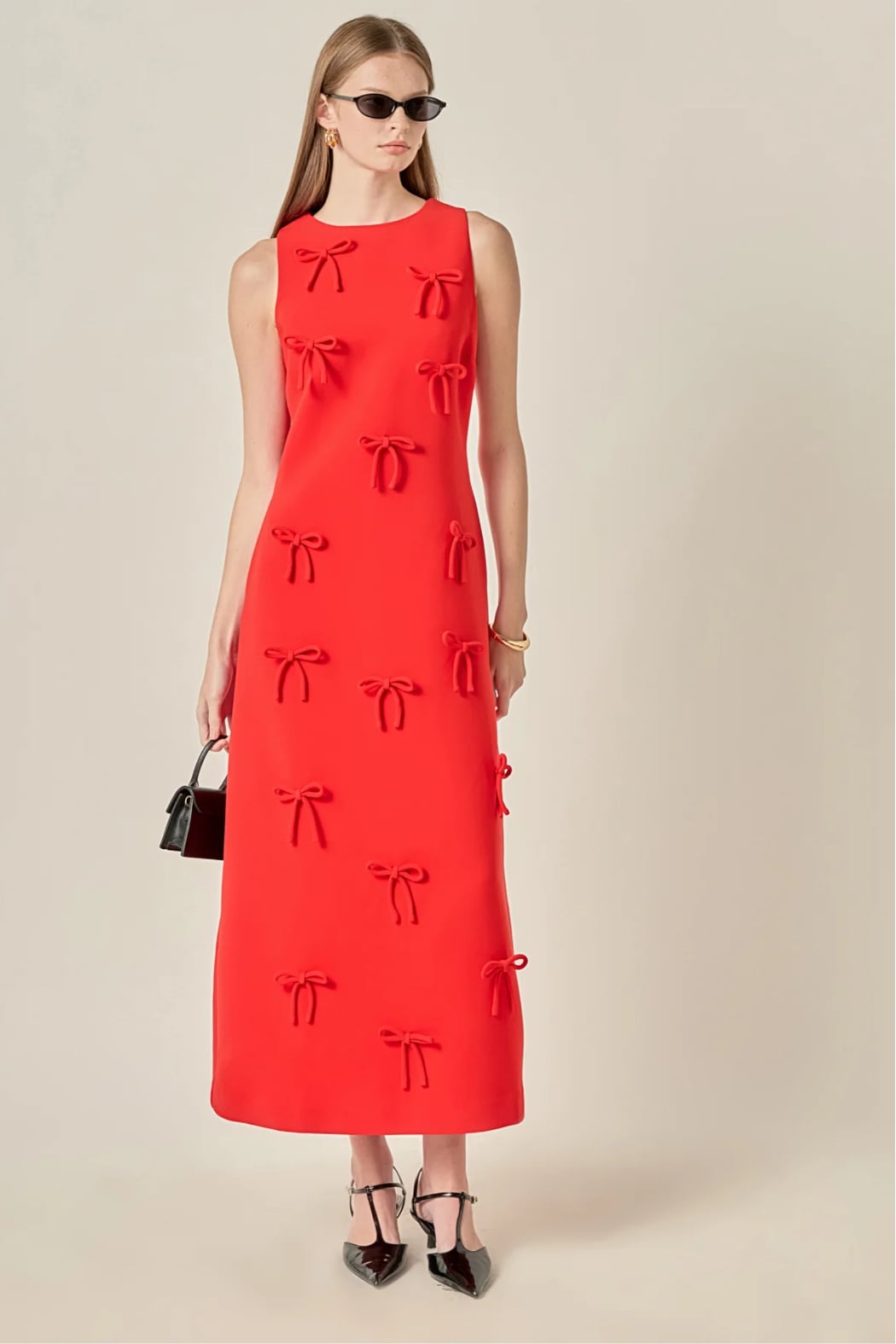 Playful sophistication reimagined. The Bow Detailed Sleeveless Midi Dress features a clean A-line silhouette adorned with sculptural bow appliqués for a touch of whimsy and charm. Crafted from smooth, structured fabric, it offers a flattering drape that moves gracefully with every step. The minimalist neckline and sleeveless design balance the statement detailing, creating a look that’s equal parts bold and feminine. Perfect for luncheons, soirées, or gallery openings — this piece brings artful elegance to any occasion.