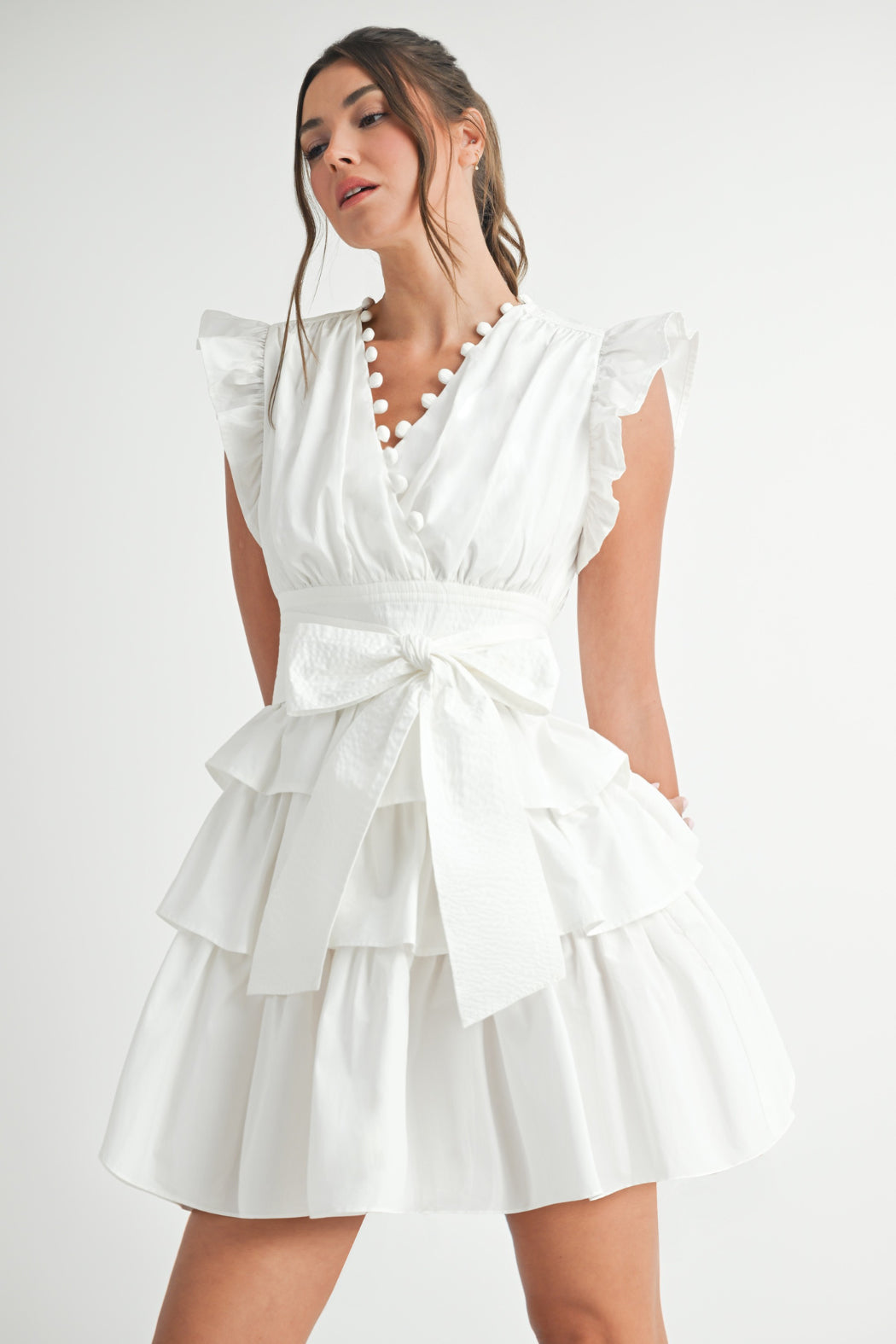 This cotton mini dress features short sleeves and a tie waist for a customizable fit. It is adorned with a trimmed neckline and a tiered ruffled silhouette, creating an elegant and charming look. A back zipper and shirred back provide added comfort and ease of wear. Its versatile design makes it ideal for any occasion