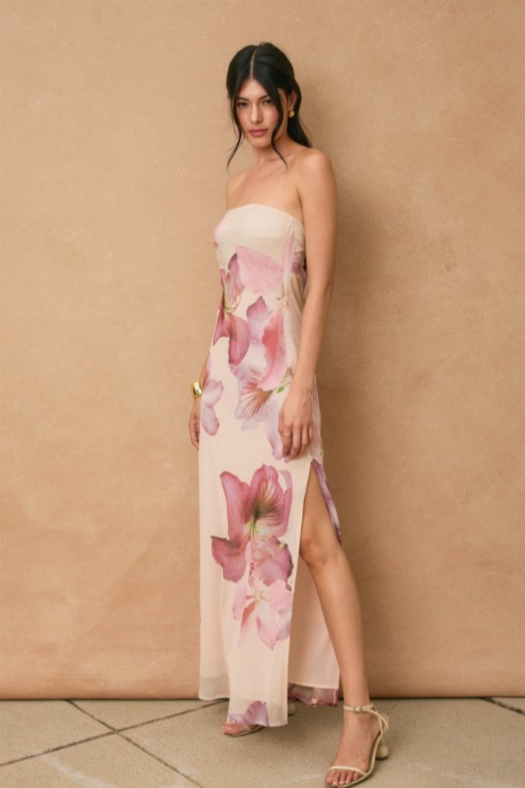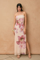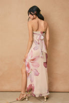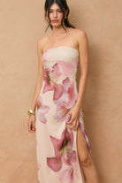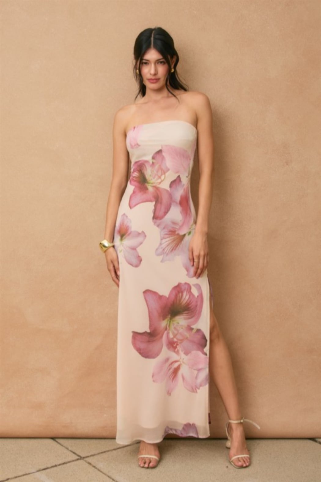 Floral print chiffon strapless maxi dress. Model is 5'8" and wearing size Small.