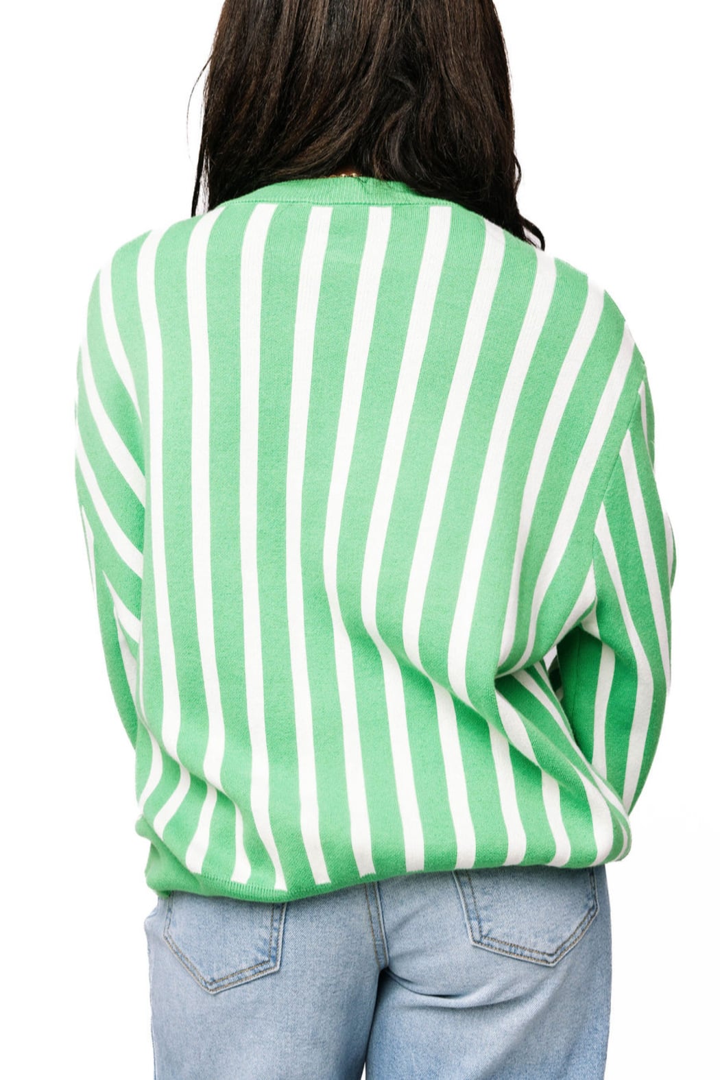 A playful striped sweater with a large beaded shamrock applique that brings instant St. Patrick’s Day cheer. The Striped Shamrock Sweater has a classic crew neckline and a relaxed, slightly boxy silhouette for easy layering. Queen Of Sparkles designed this piece with sequined and jewel embellishments at the center for a festive, eye-catching finish. Wear it with jeans for a casual, cozy-at-home vibe or to holiday gatherings when you want a fun seasonal statement.