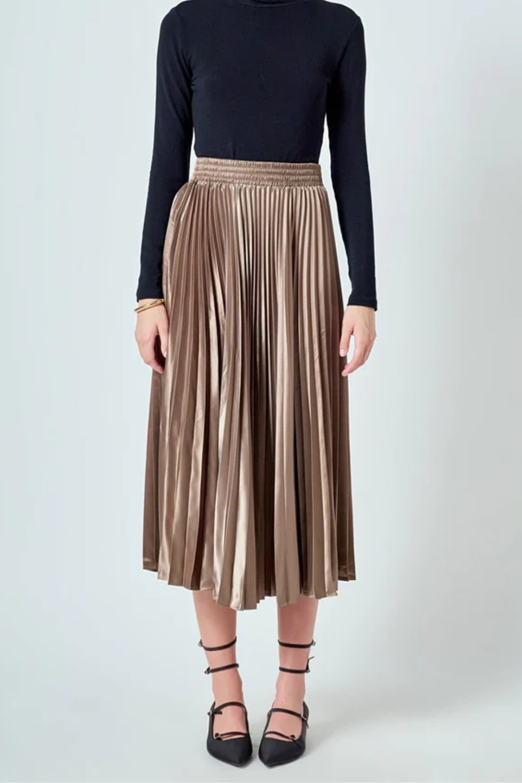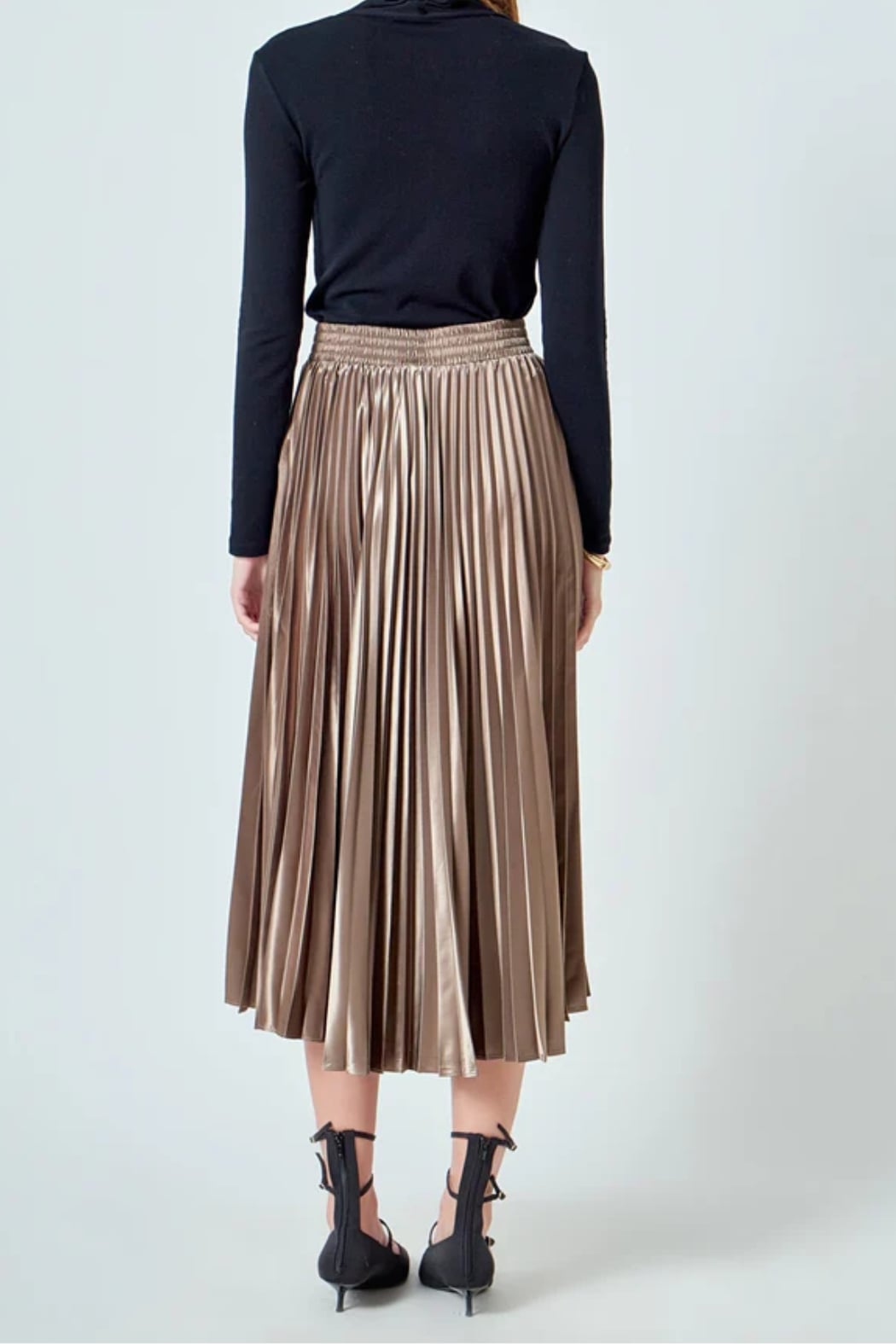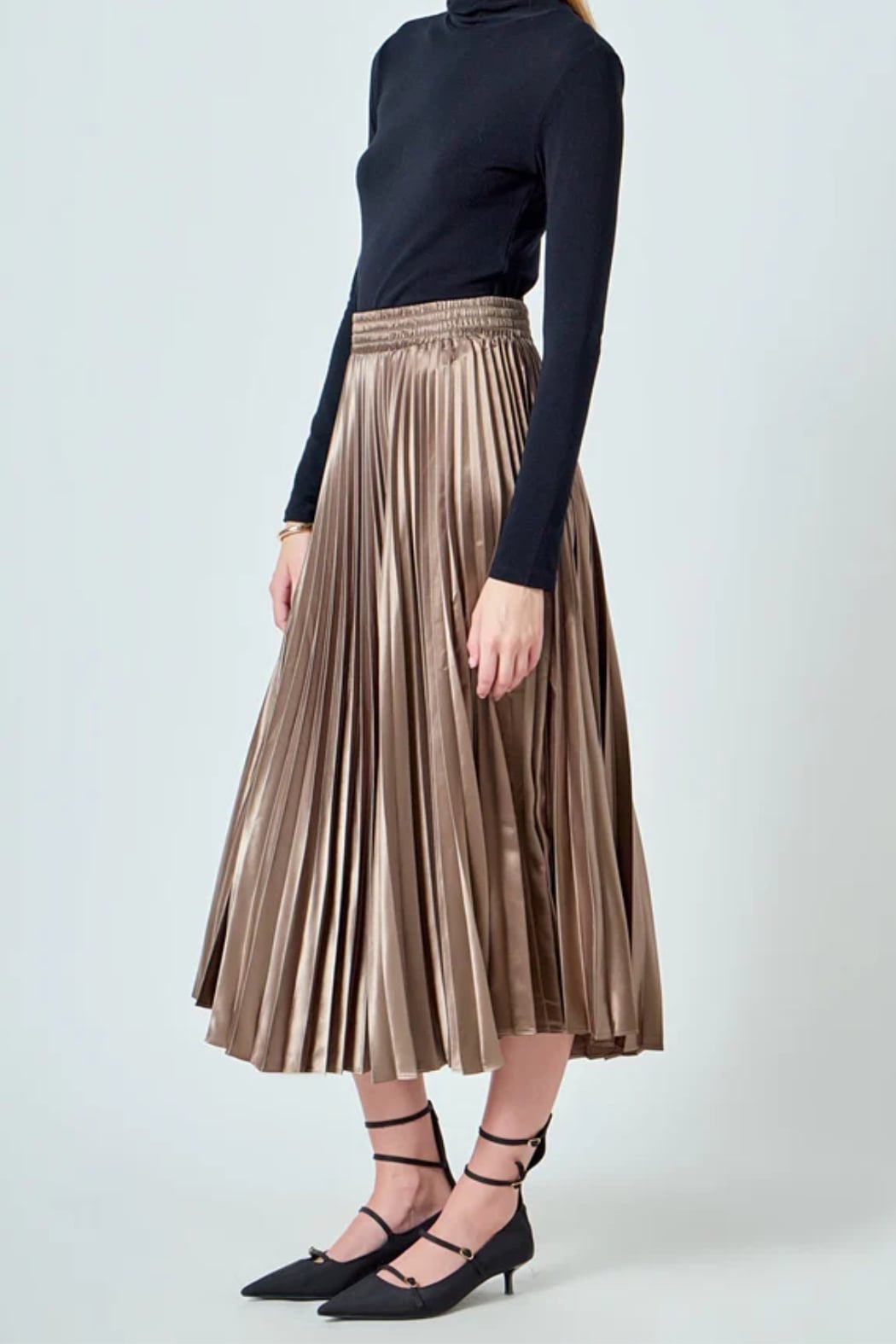 Pleated midi skirt Elastic at waist band Satin fabric Hand wash cold Do not bleach Do not tumble dry Iron low Shell: 100% Polyester Exclusive of Elastic Total length: 33", Waist: 26.75" S Height 5'9" / Bust 32" / Waist 25.5" / Hips 36"