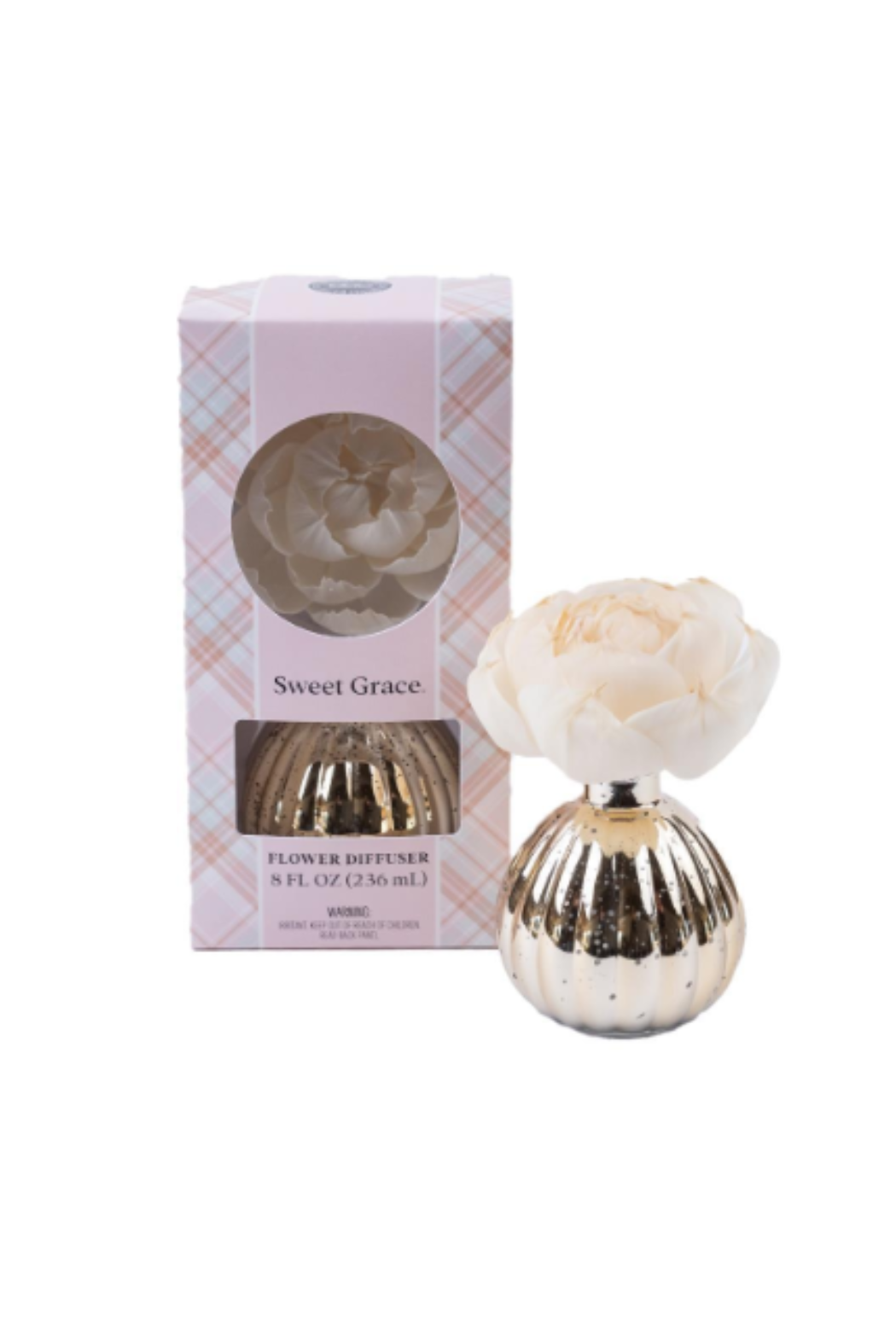 Extend the stem of the flower fully and place it into the bottle, ensuring that the wire located within the wick is fully insert Holding glass at base, carefully twist the cork out of the container. Place diffuser vase on a flat, stable surface. When all the oil has been diffused and the flower begins to lose it's color, replace your Flower Diffuser. Fragrance Description: With exotic passion fruit, sparkling tea and classic patchouli, Sweet Grace is undeniably warm, peaceful and pure. Product Size (inches): 3.75l x 3.75w x 6h