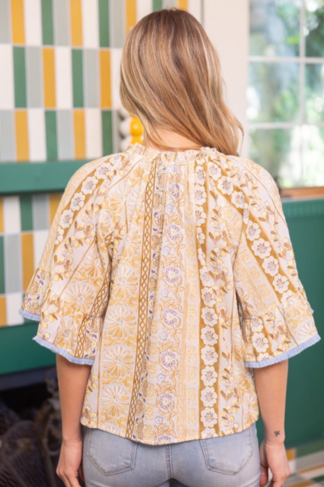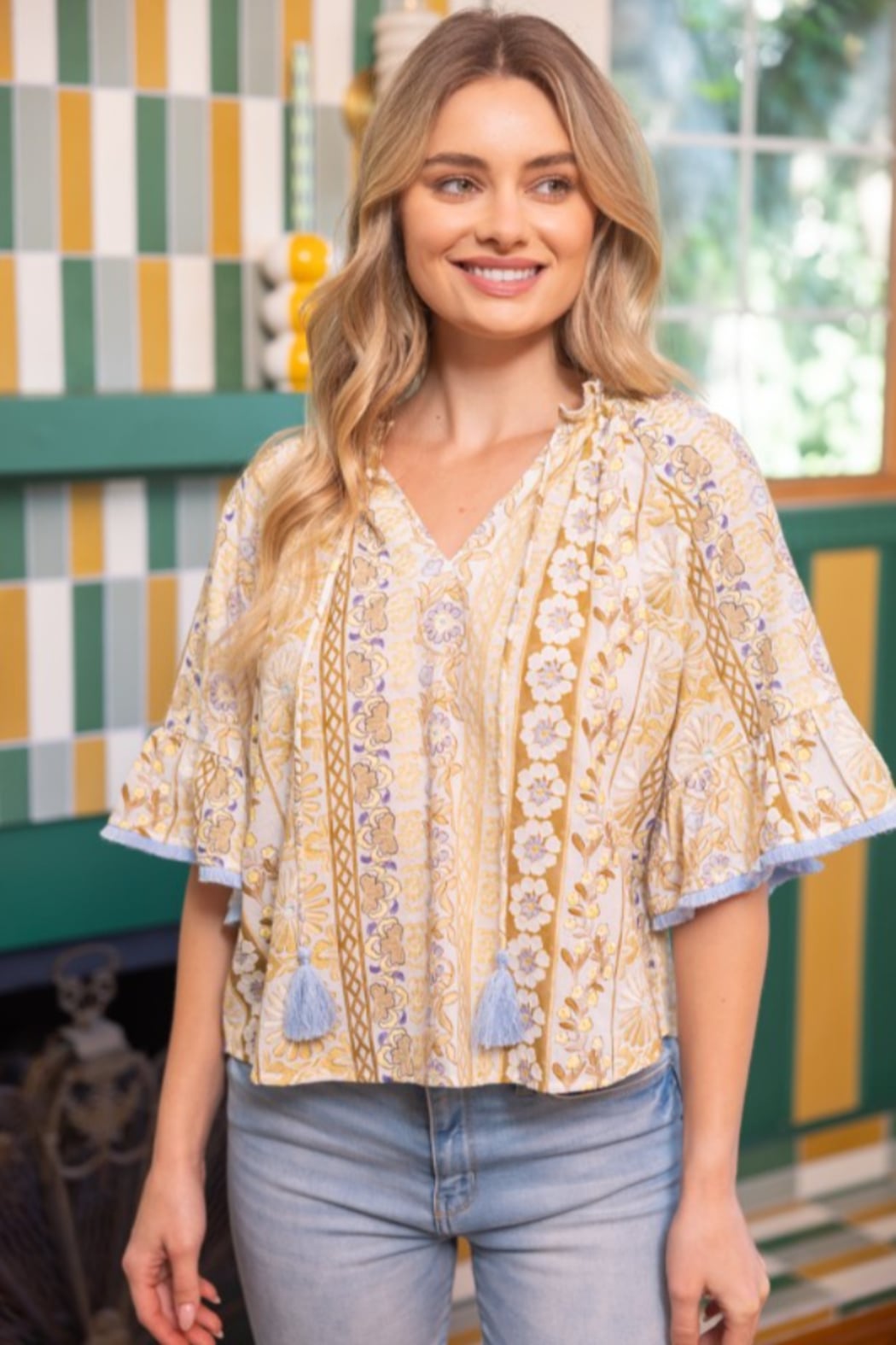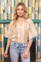A breezy patterned top designed with contrast tassel ties for a playful, elevated finish. Featuring a relaxed fit, split neckline, and short flutter sleeves with contrast trim, this lightweight style brings vibrant charm to spring summer boutique assortments