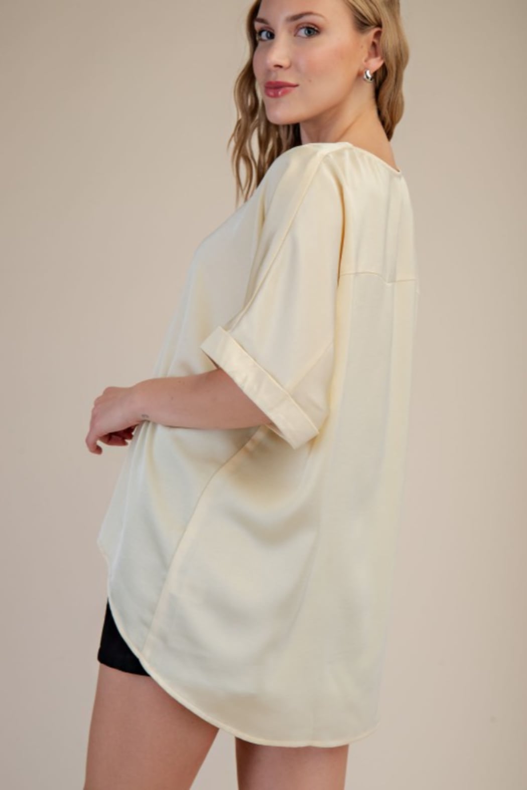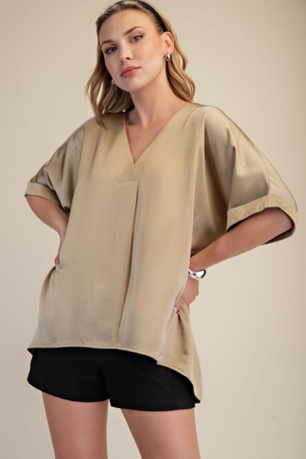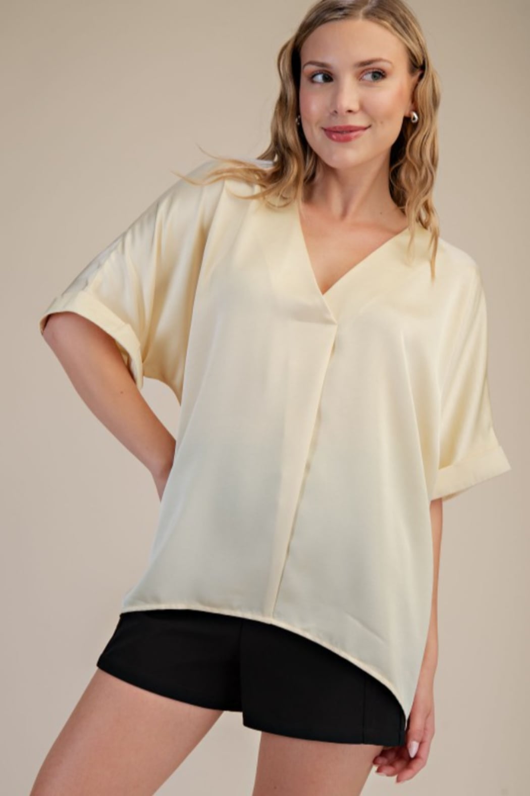 V-neck High Low Blouse Model Height: 5'8" Wearing Size Small Fabric Contents 100% Polyester Made in China
